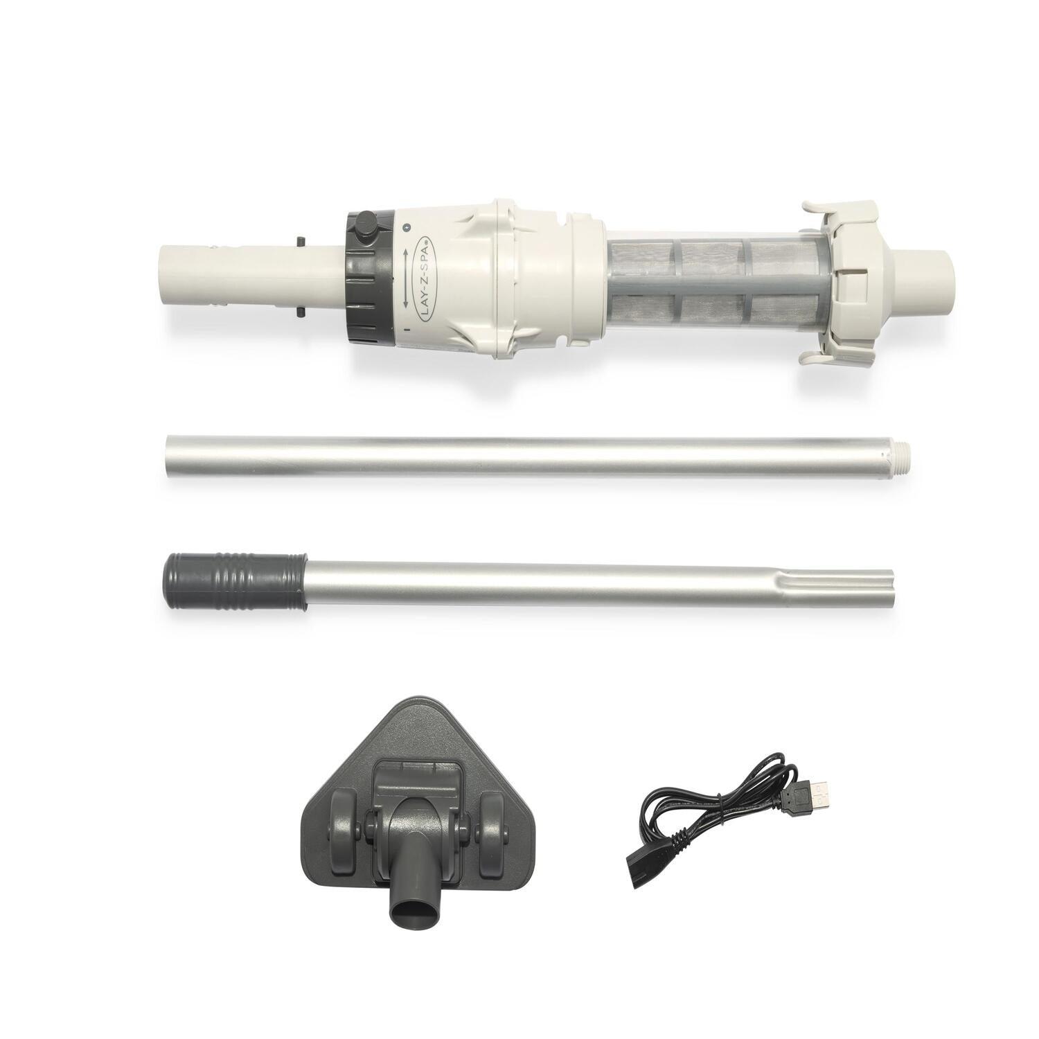 Mantenga su spa o piscina pequeña limpia y despejada con la aspiradora subacuática recargable Lay-Z-Spa®. La aspiradora inalámbrica viene con un cable de carga USB, que le dará a la batería suficiente energía para durar 30 minutos. El poste del limpiafondos alcanza los 5 pies, lo que hace que el fondo de la piscina sea fácil de alcanzar y limpiar. Limpie el moho, el limo y los escombros con toda la facilidad de aspirar una alfombra limpia bajo el agua. Los desechos se recogen en un filtro de acero inoxidable fácil de vaciar, que es transparente para permitirle ver cuando está lleno.