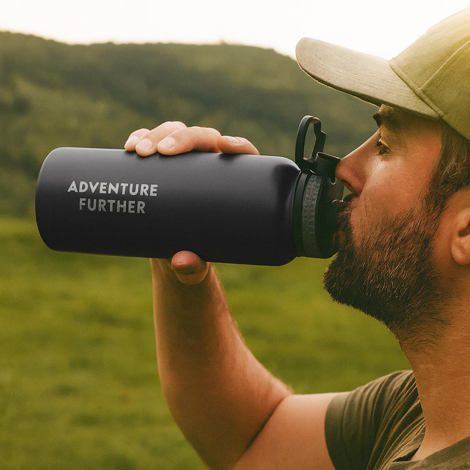 Botella reutilizable de acero inoxidable, ideal para actividades al aire libre, deportivas o uso diario. Cuenta con un diseño robusto y práctico, con tapa roscada y asa para fácil transporte.