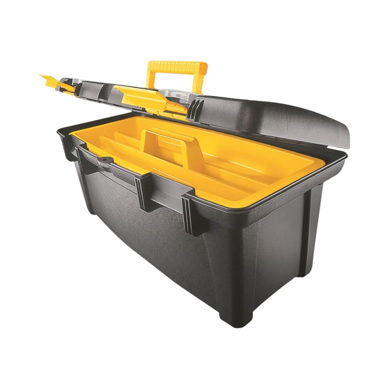 Esta caja es más que un simple contenedor; es un portal hacia la eficiencia y la practicidad. En su amplio espacio, encontrarás un hogar para tus herramientas más esenciales: martillos, llaves, alicates, destornilladores y mucho más. Caja de herramientas grande, resistente y funcional. Sirve para almacenar las herramientas necesarias para realizar cualquier trabajo. Se pueden guardar martillos, llaves, alicates, destornilladores, pinzas, juego de dados, entre otros. Adicionalmente, cuenta con prácticos compartimientos que nos permiten clasificar e identificar rápidamente aquellos elementos de tamaño pequeño, además de que evitamos que se pierdan con facilidad. Resiste hasta 40 Kg