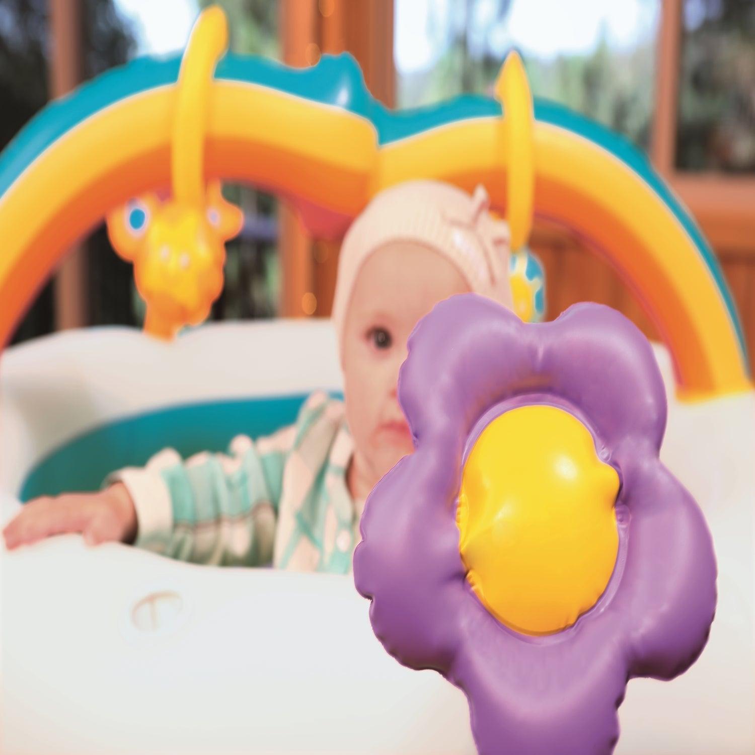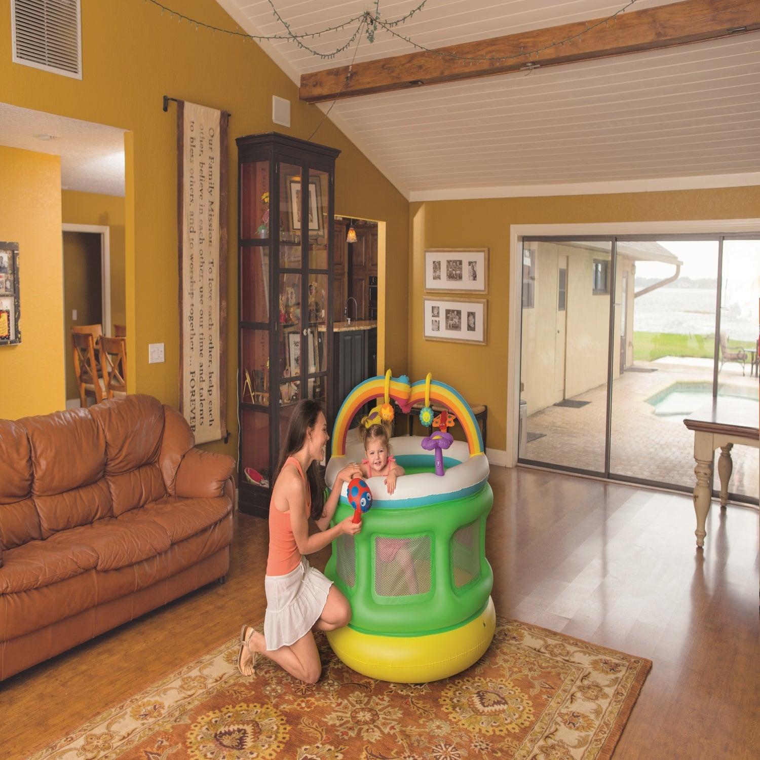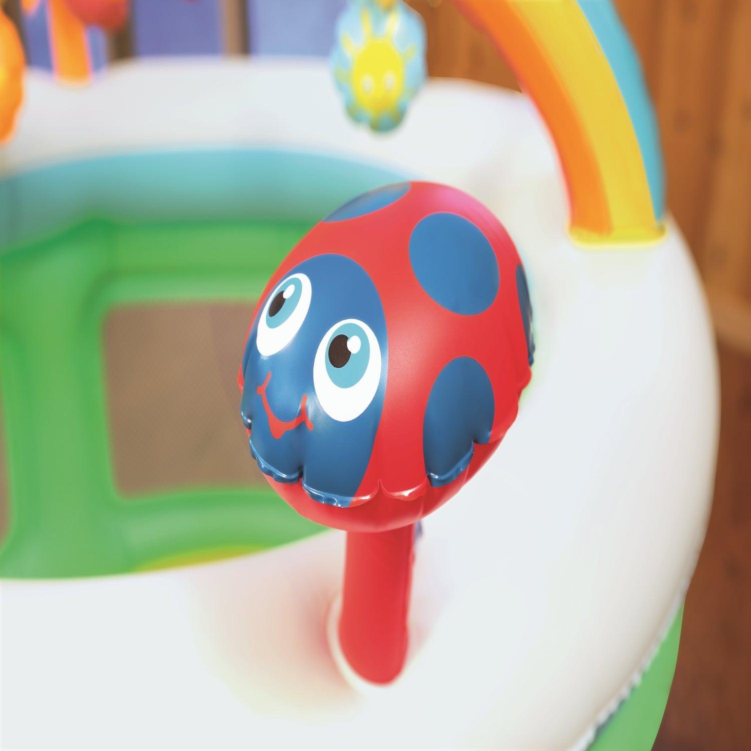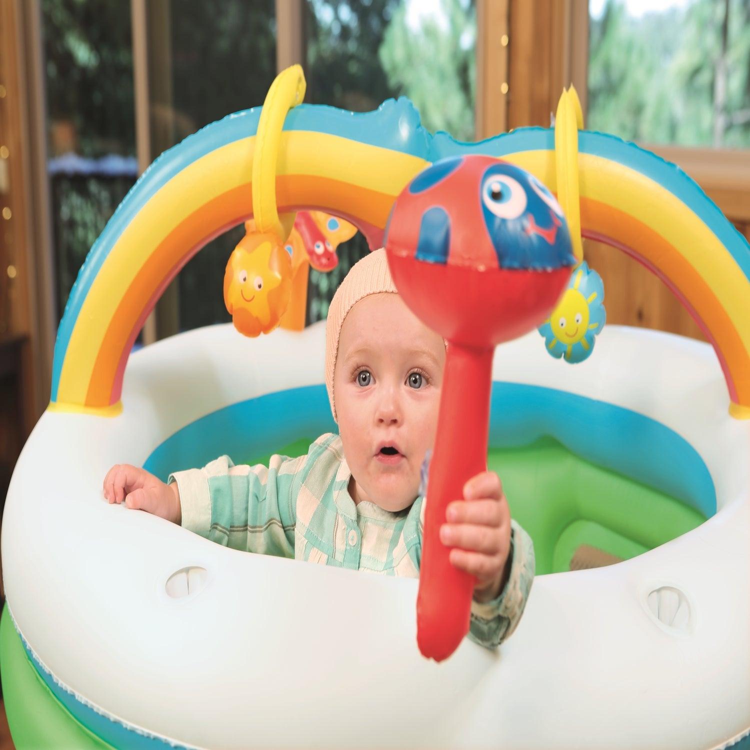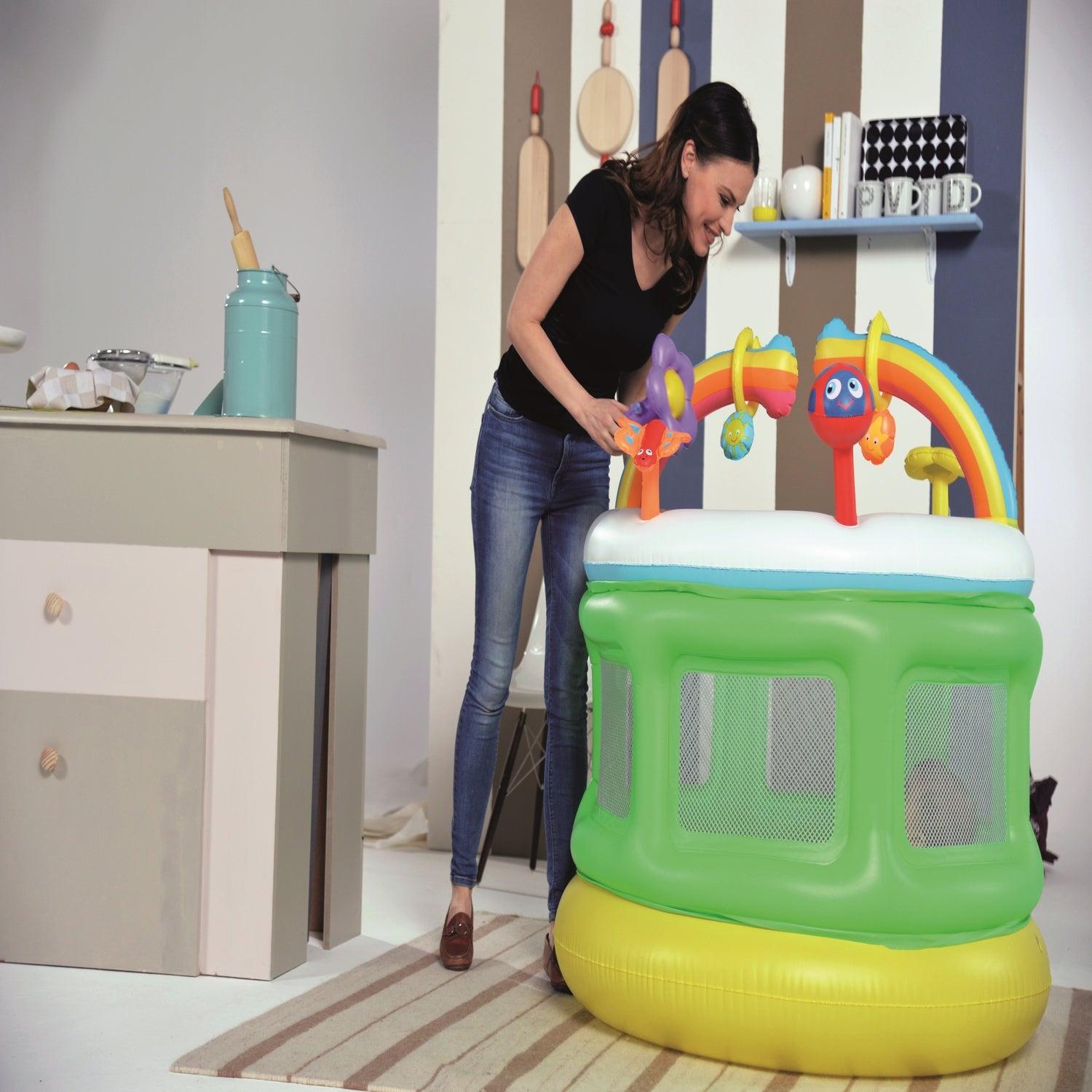 Centro de Juegos Inflable Baby Playpen de Bestway en la que tu bebé podrá entretenerse y divertirse sin riesgo. Posee un diámetro de 1.09 mts. y una altura de 1.04 mts. Cuenta con suelo y estructura inflables que ofrecen un mayor comfort, Redes en las paredes que facilitan la supervisión del adulto, Arcoiris para encajar aros, 2 juguetes con sonido al ser apretados.