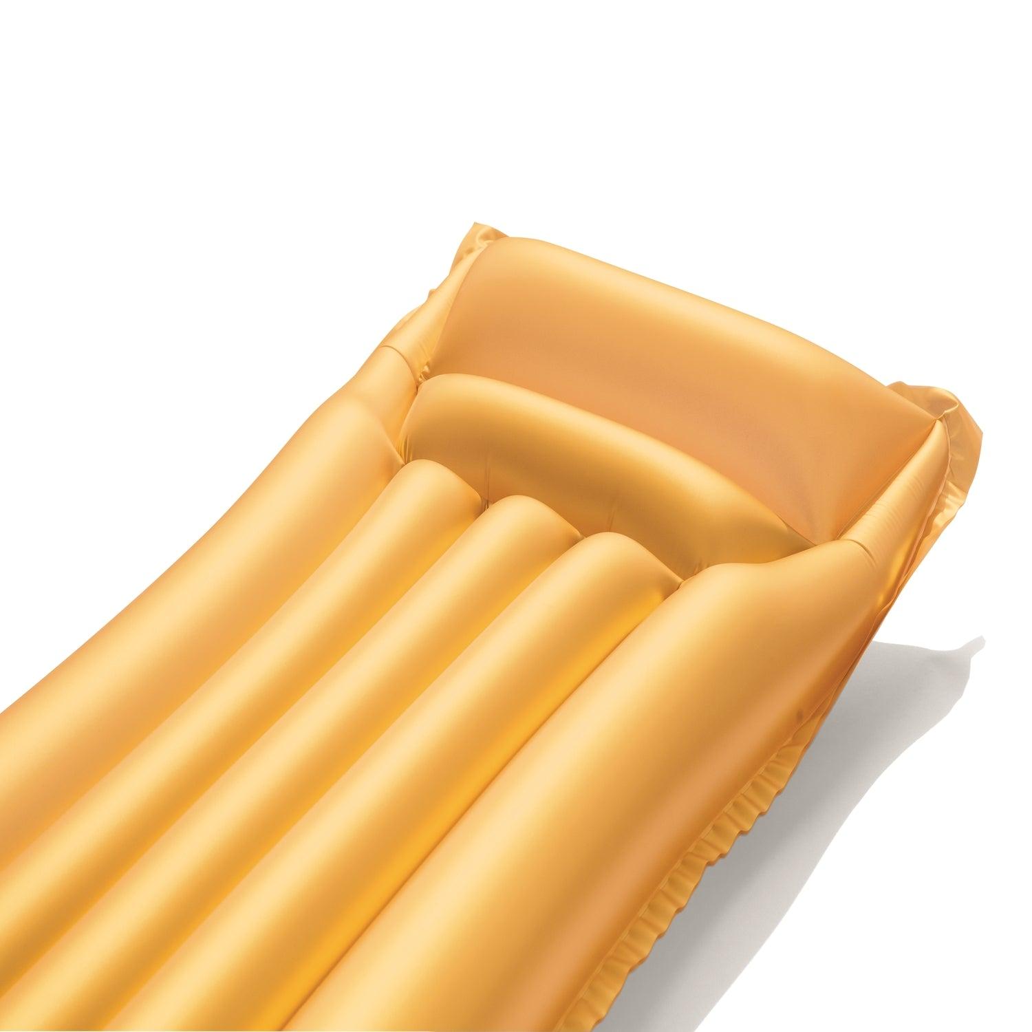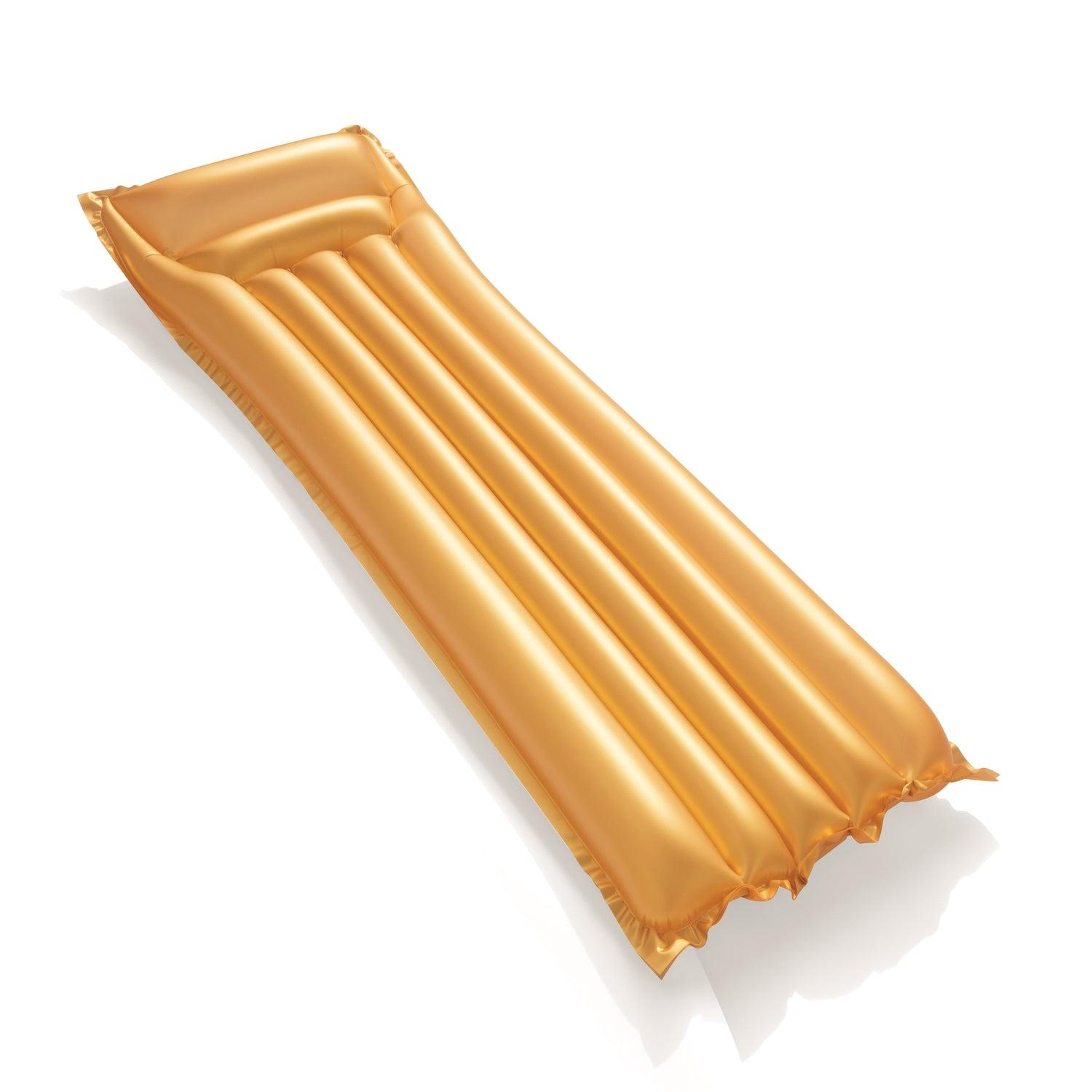 La colchoneta inflable Gold Swim es la colchoneta con más glamur sobre la que tomar el sol. Olvídate de los aburridos inflabes de PVC y elige la colchoneta inflable Gold Swim con un acabado brillante especialmente diseñado. Apoya la cabeza y el cuello en su amplia almohada de aire de dos cámaras y échate una buena siesta en el agua el algún momento de la tarde. Con 6 pies (1,83 m) de largo, este inflable es del tamaño ideal para casi todo el mundo, y las personas más altas pueden posar los pies en el agua mientras descansan.