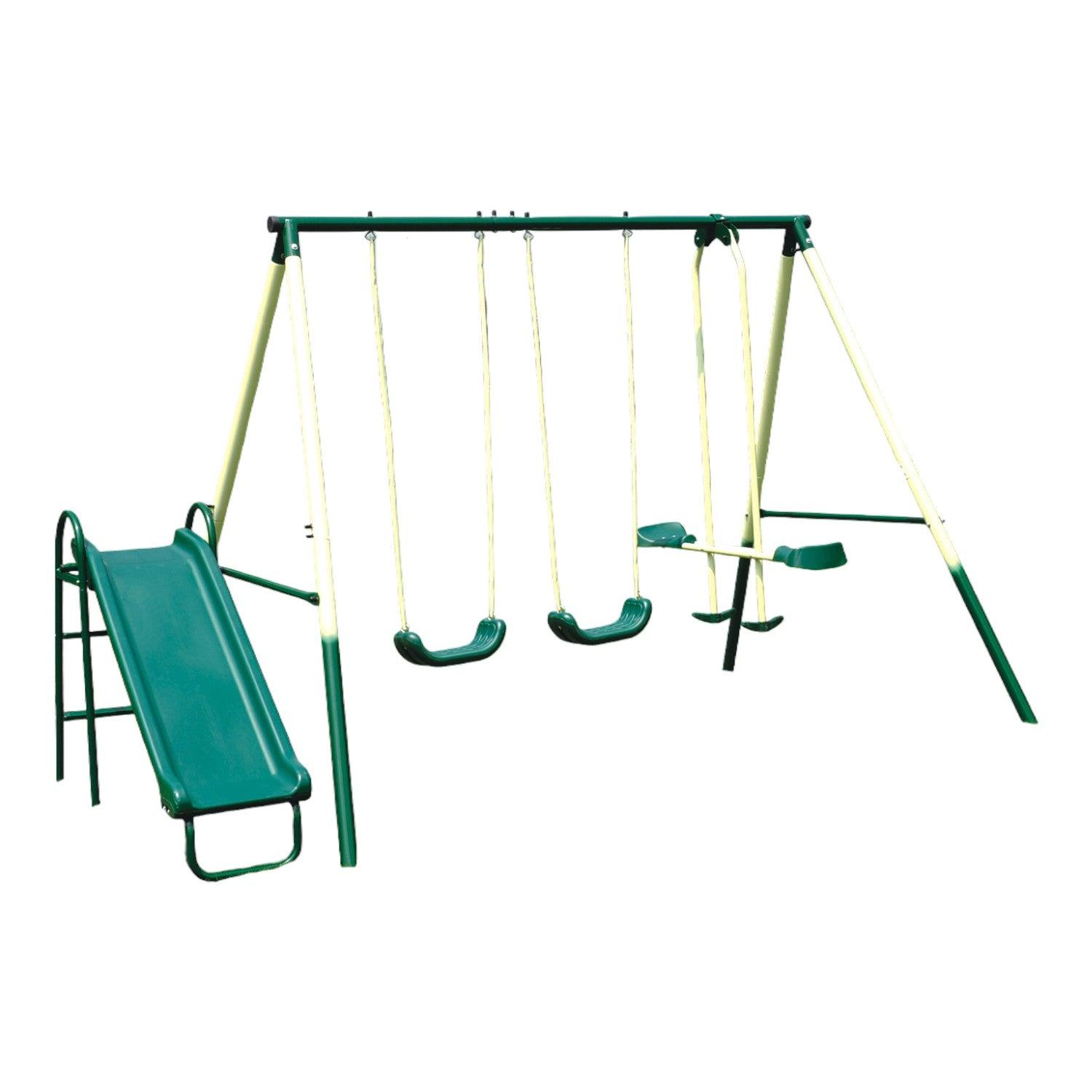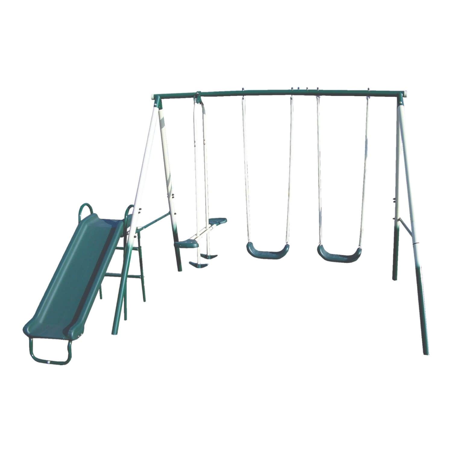 • Estación de juegos para niños. Incluye: 2 columpios, 1 balancín y 1 resbalín