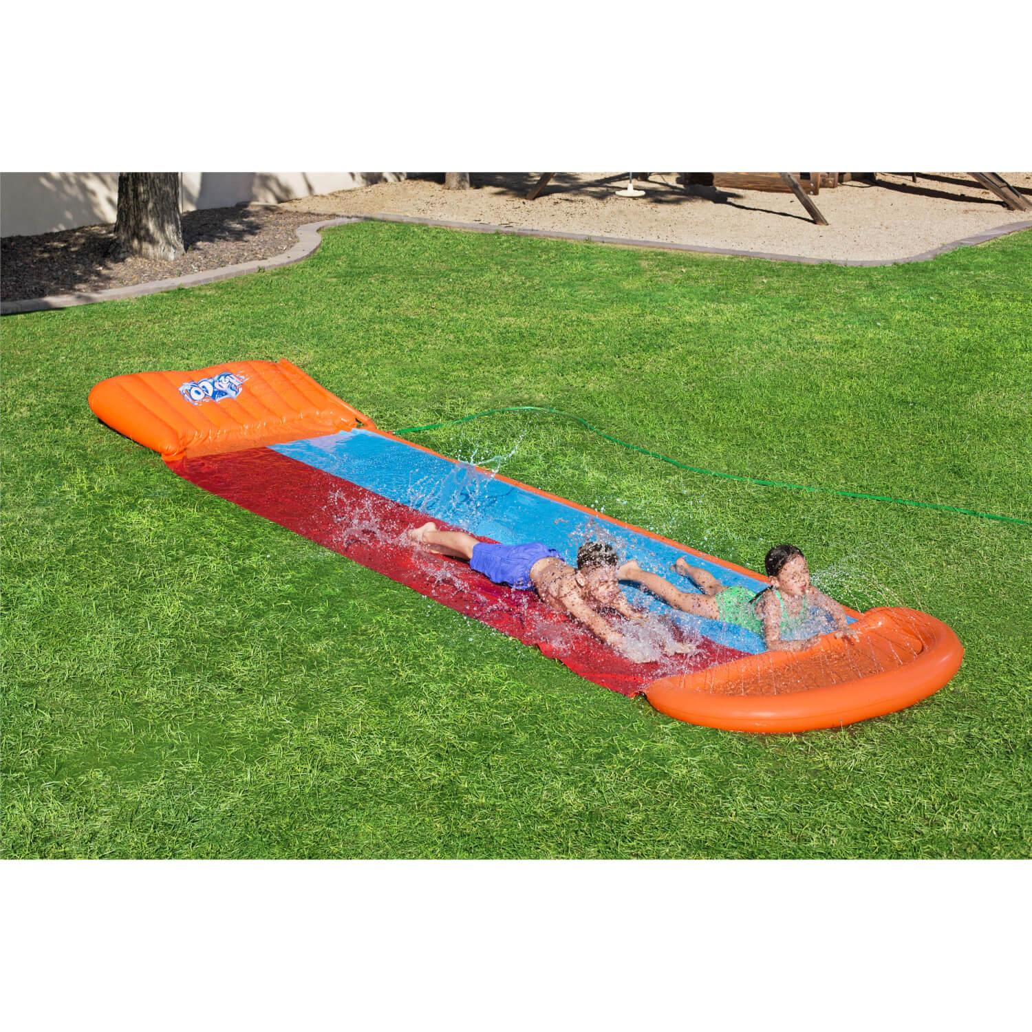 Disfrute de un tiempo salvaje y divertido al aire libre y un paseo mojado con el tobogán acuático Bestway. Te brinda más diversión de verano con una plataforma de aterrizaje acolchada y una rampa de velocidad en la parte delantera. Este tobogán inflable cuenta con un despegue de salpicaduras y secciones dobles extralargas para dos personas que van al mismo tiempo. Invita a un amigo a participar en la acción y compite para ver quién llega primero al final. También cuenta con una piscina poco profunda con parachoques en los extremos. ¡Simplemente conecte una manguera de jardín y listo!