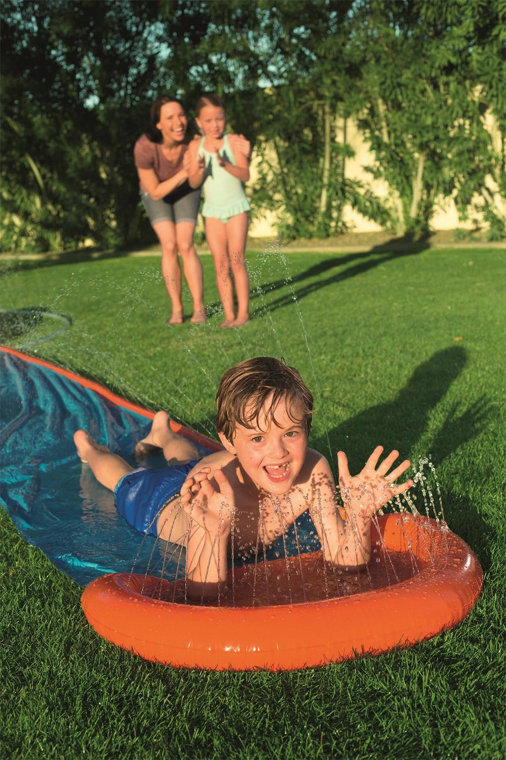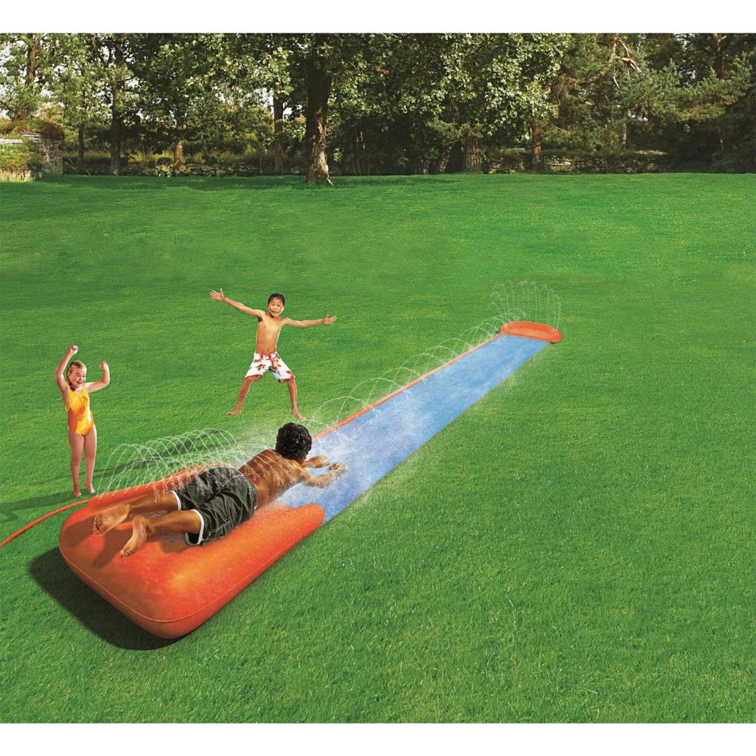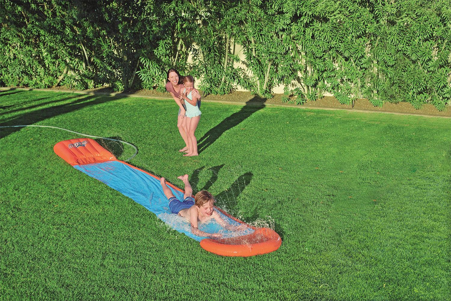 ¡El deslizador simple H2OGO!™ es un clásico que no puede faltar en tu jardín para un verano lleno de diversión! Es súper fácil de instalar: simplemente conéctalo a una manguera de jardín y empieza a deslizarte. Este deslizador de 533 cm de largo tiene una rampa de velocidad y una pequeña piscina en el otro extremo para un deslizamiento suave y rápido… ¡y un aterrizaje con chapuzón! Los peques desearán tener este fantástico deslizador en su jardín y los padres alucinarán con lo fácil que es de instalar. Con este deslizador, ¡podrán deslizarse a gran velocidad, sentados o tumbados, y vivir momentos muy divertidos!