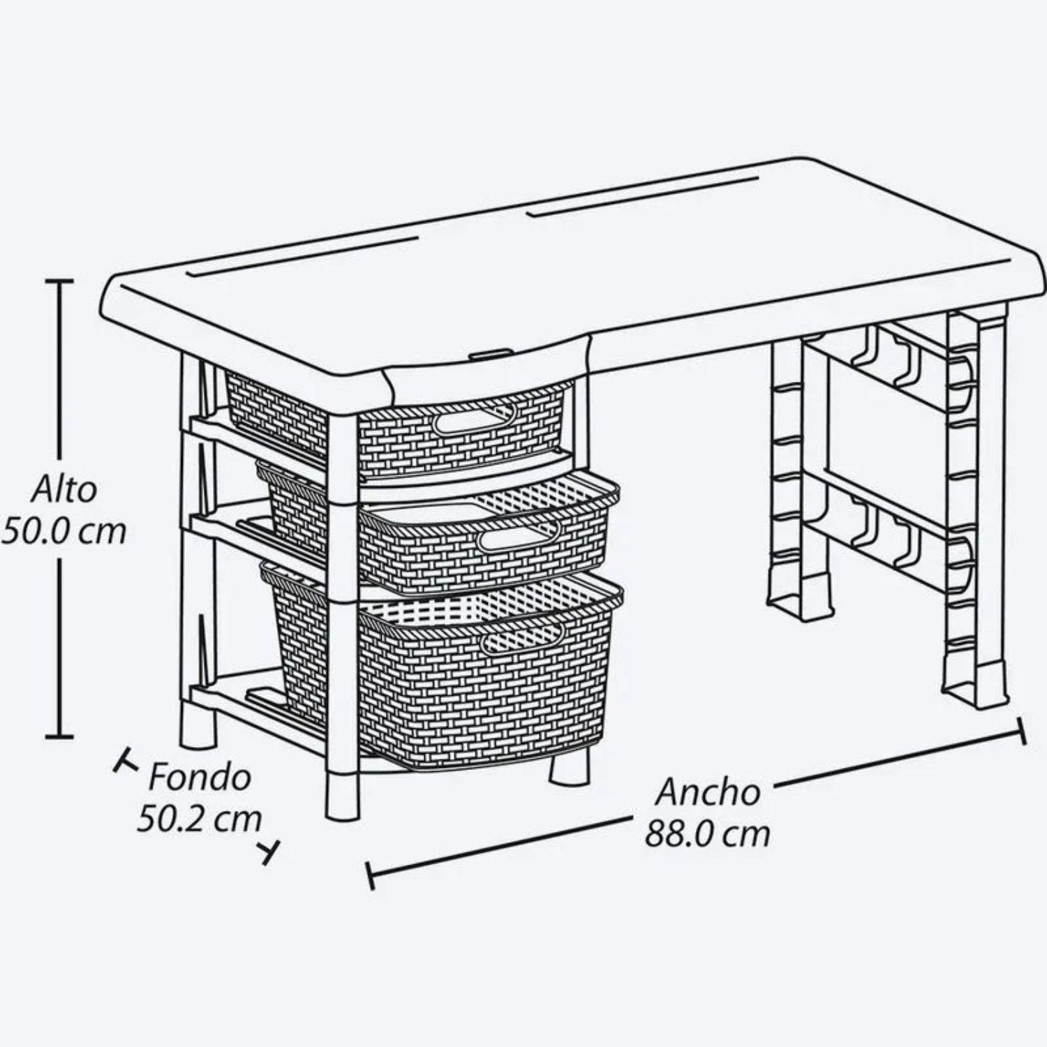 - • Incluye 3 cajones tipo canasto estilo rattan para organización.