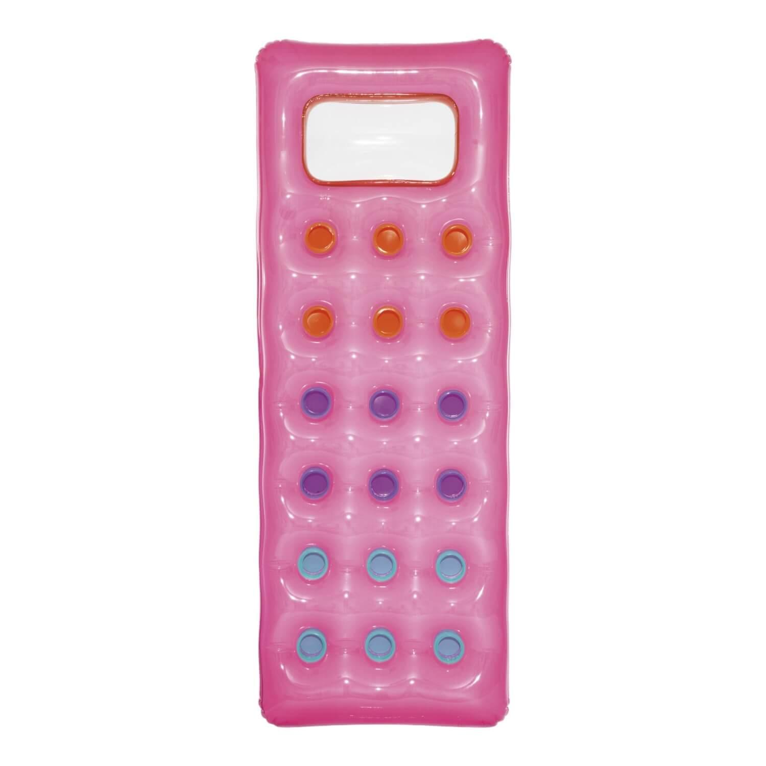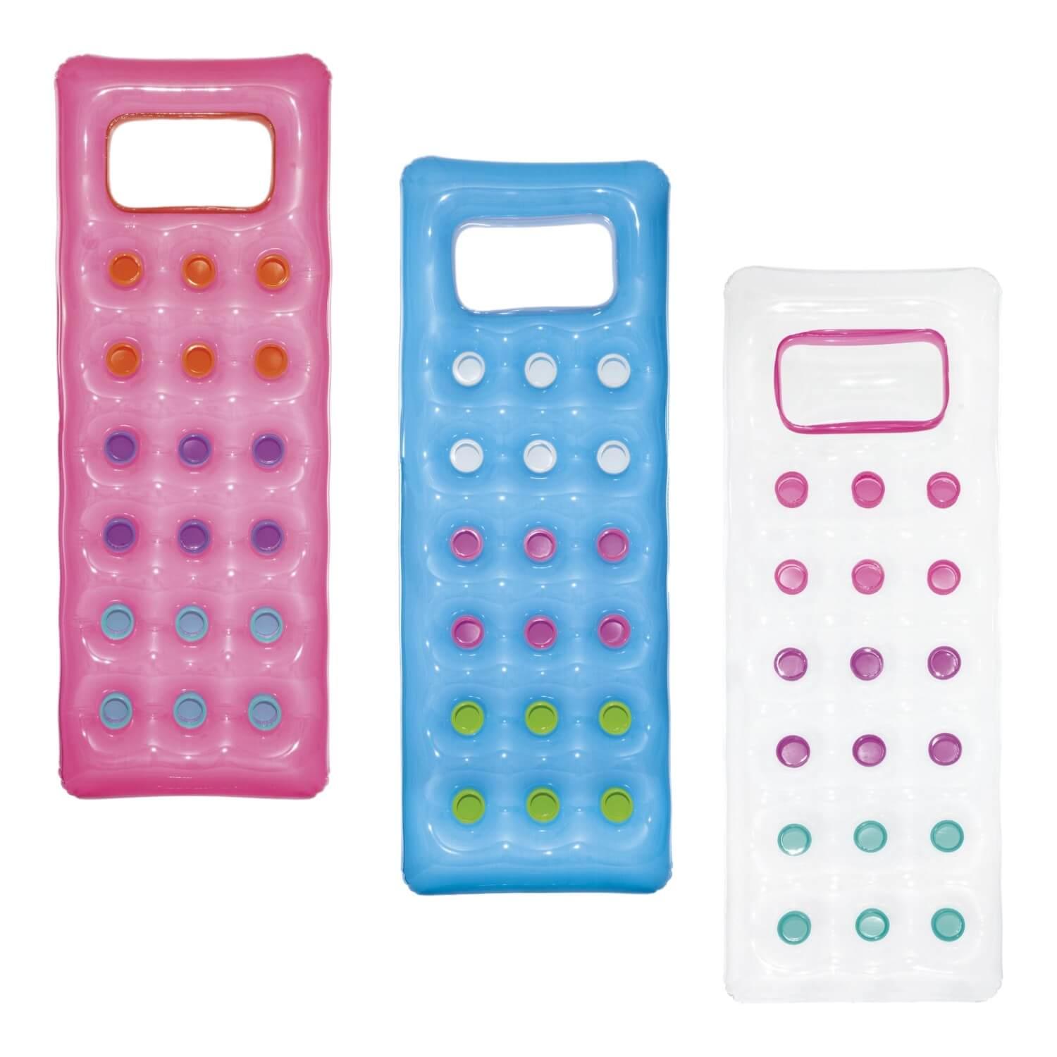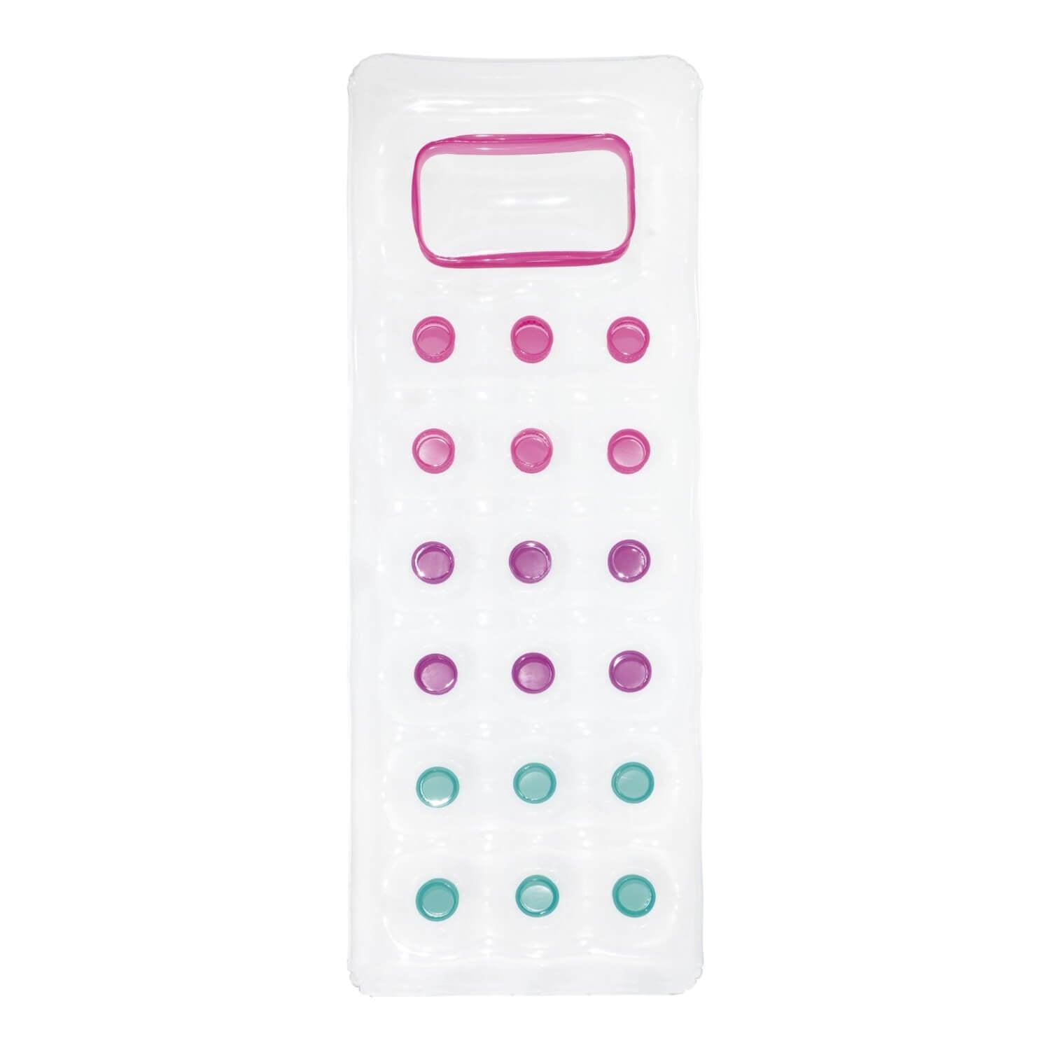 Vaya a la piscina o a la playa con el moderno y elegante Fashion Lounge. No tire la moda por la ventana cuando llegue la próxima ola de calor, use esta colchoneta para mantenerse fresco, en más de un sentido. No se preocupe por trabajar con el inflado, ya que el diseño de dos cámaras de aire lo hace rápido y fácil. La almohada incorporada es lo suficientemente cómoda para las siestas de la tarde y es transparente para lograr un efecto divertido. Los coloridos puntos de la bobina son visibles a través del flotador.