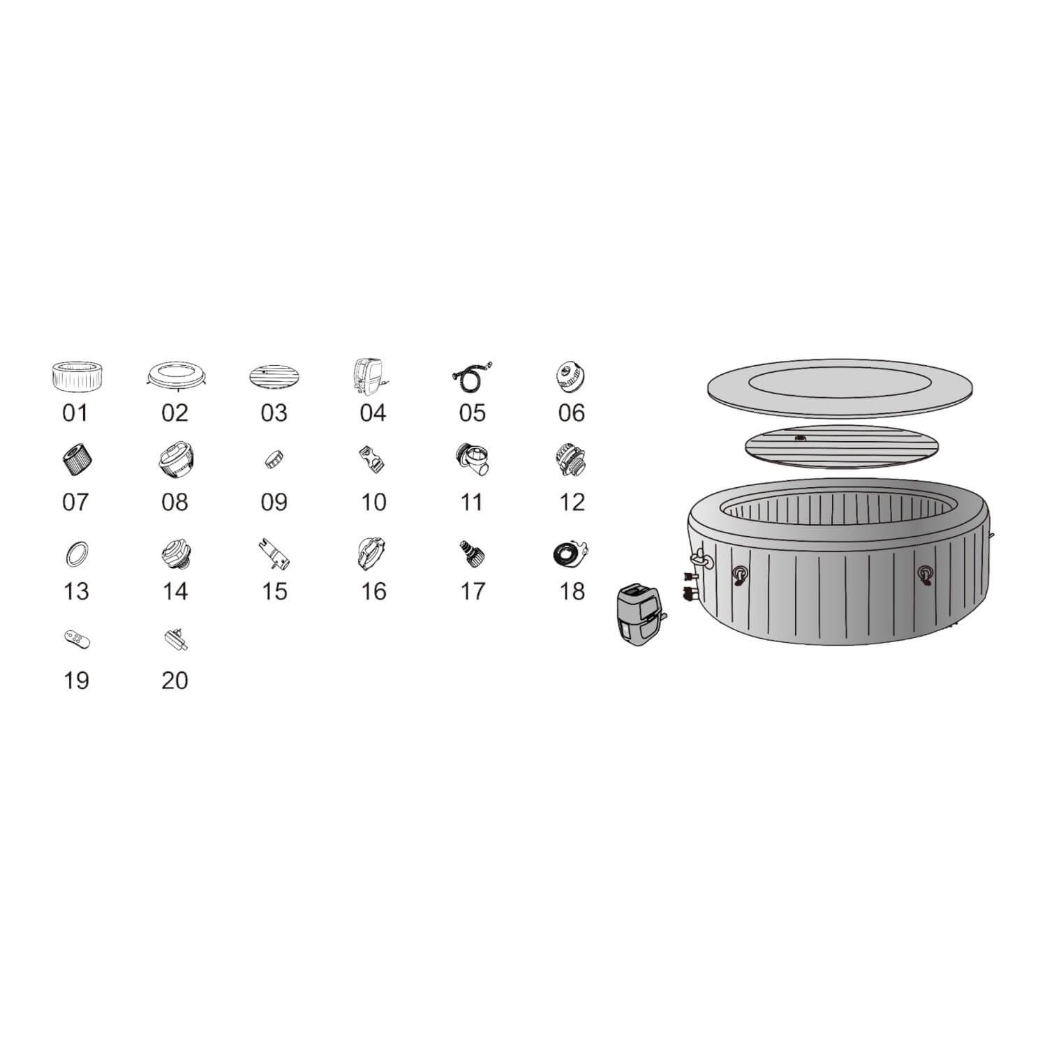 • Contenido: 1 spa, 1 cubierta para piscina, 1 bomba de spa, cartucho de filtro (VI), 1 tira de luces LED, 1 dispensador ChemConnect™, parche de reparación, sistema AirJet™