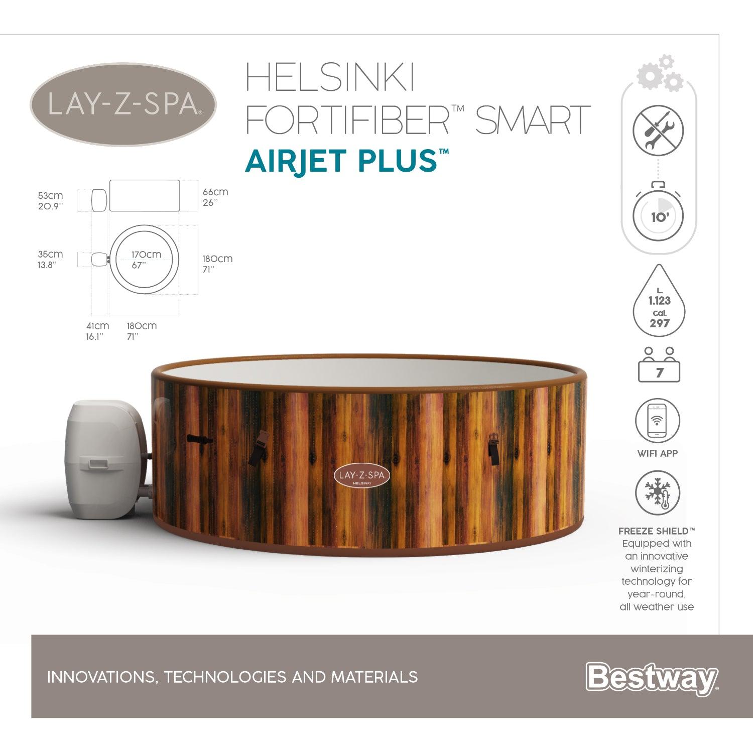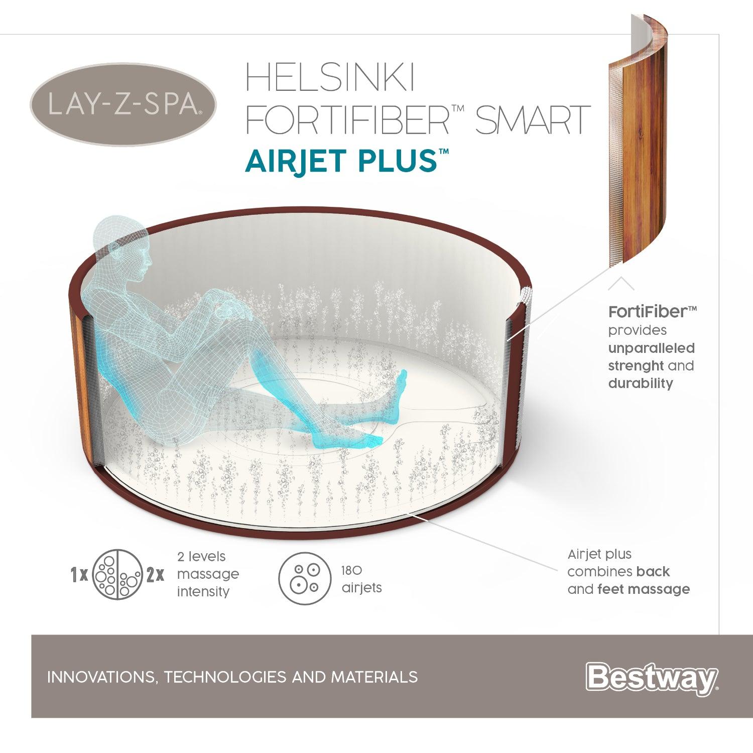 Después de un largo día, no hay nada más relajante que entrar en agua caliente y burbujeante en tu propio jardín. El Lay-Z-Spa® Helsinki AirJet™ proporciona una experiencia de masaje mejorada y relajante para hasta 7 personas, sin dejar de ser rápido y sencillo de montar. Este spa alcanza hasta 40ªC (104ªF) para proporcionar la máxima relajación mientras estás rodeado de 180 burbujas de masaje AirJet especialmente dirigidas a tu espalda. Sólo tienes que conectar la bomba y ver cómo se infla.