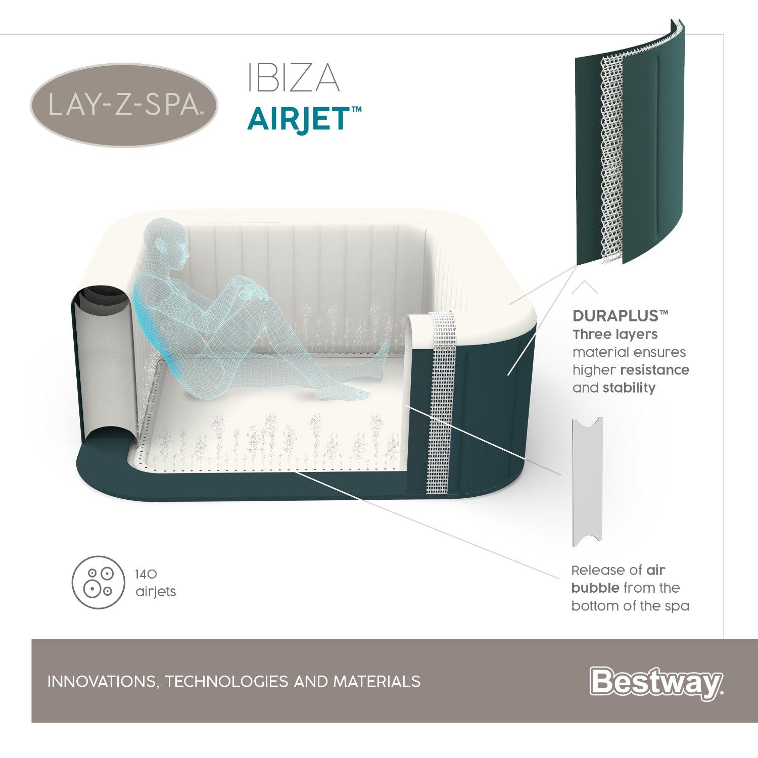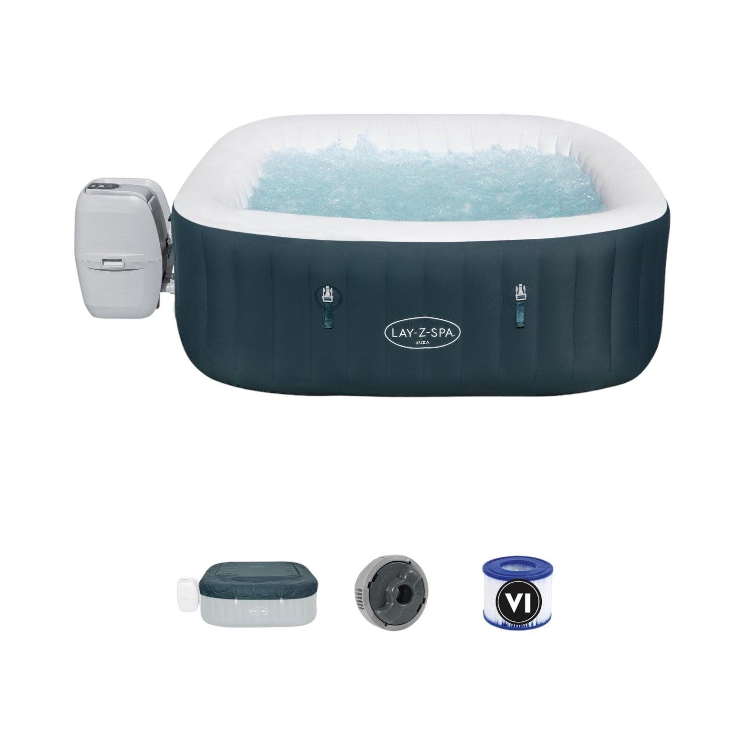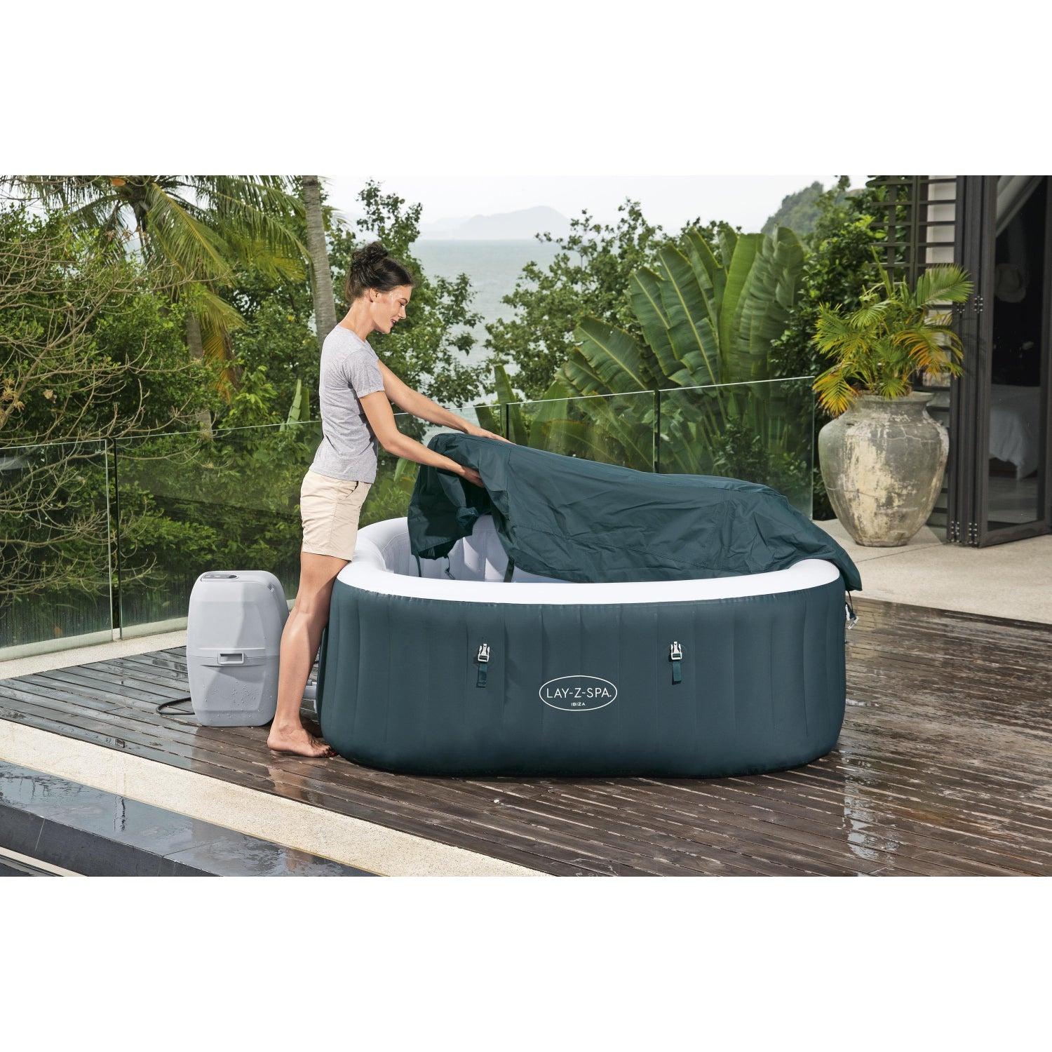 Contenido: Equipado con una bomba que infla rápidamente el spa, lo calienta, ejecuta la filtración y controla el sistema de masaje, este spa es fácil y cómodo. La bomba se puede alcanzar fácilmente desde el interior del spa y cuenta con portavasos para bebidas y aperitivos. También se incluye un dispensador ChemConnect™ que mantiene el agua limpia y sana dispersando uniformemente la cantidad adecuada de cloro. Por si fuera poco, el spa Ibiza viene con una cubierta reforzada que bloquea el calor mientras no se usa, además de evitar que el polvo y los residuos se acumulen en el agua.