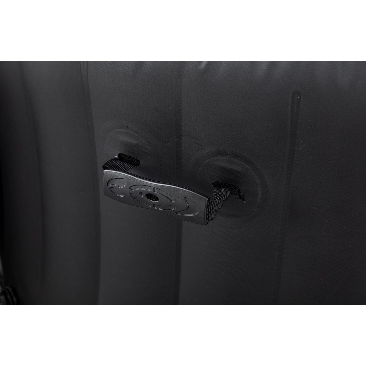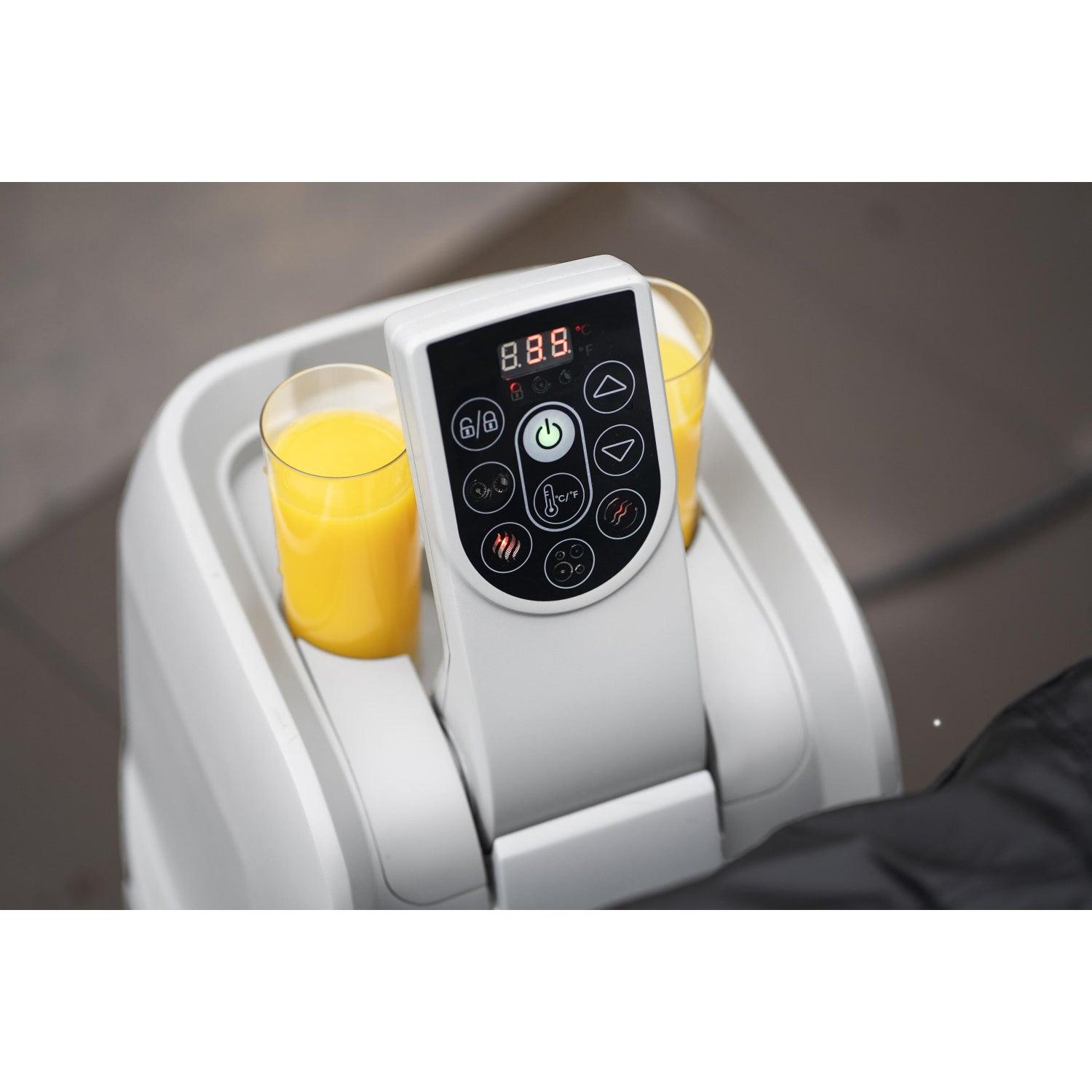 Panel de control digital y bomba de spa con sistema de filtración integrado que incluye portavasos y es accesible desde el interior del spa