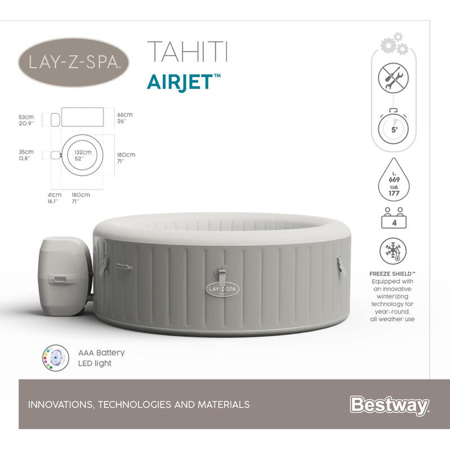 Después de un largo día, no hay nada más relajante que sumergirse en agua tibia y burbujeante en su propio patio trasero. El Lay-Z-Spa® Tahiti AirJet™ brinda una experiencia de masaje relajante para hasta 4 personas y, al mismo tiempo, es rápido y fácil de configurar. Simplemente conecte la bomba y observe cómo se infla. También se incluyen luces LED para agregar ambiente y personalidad a su entorno de spa.