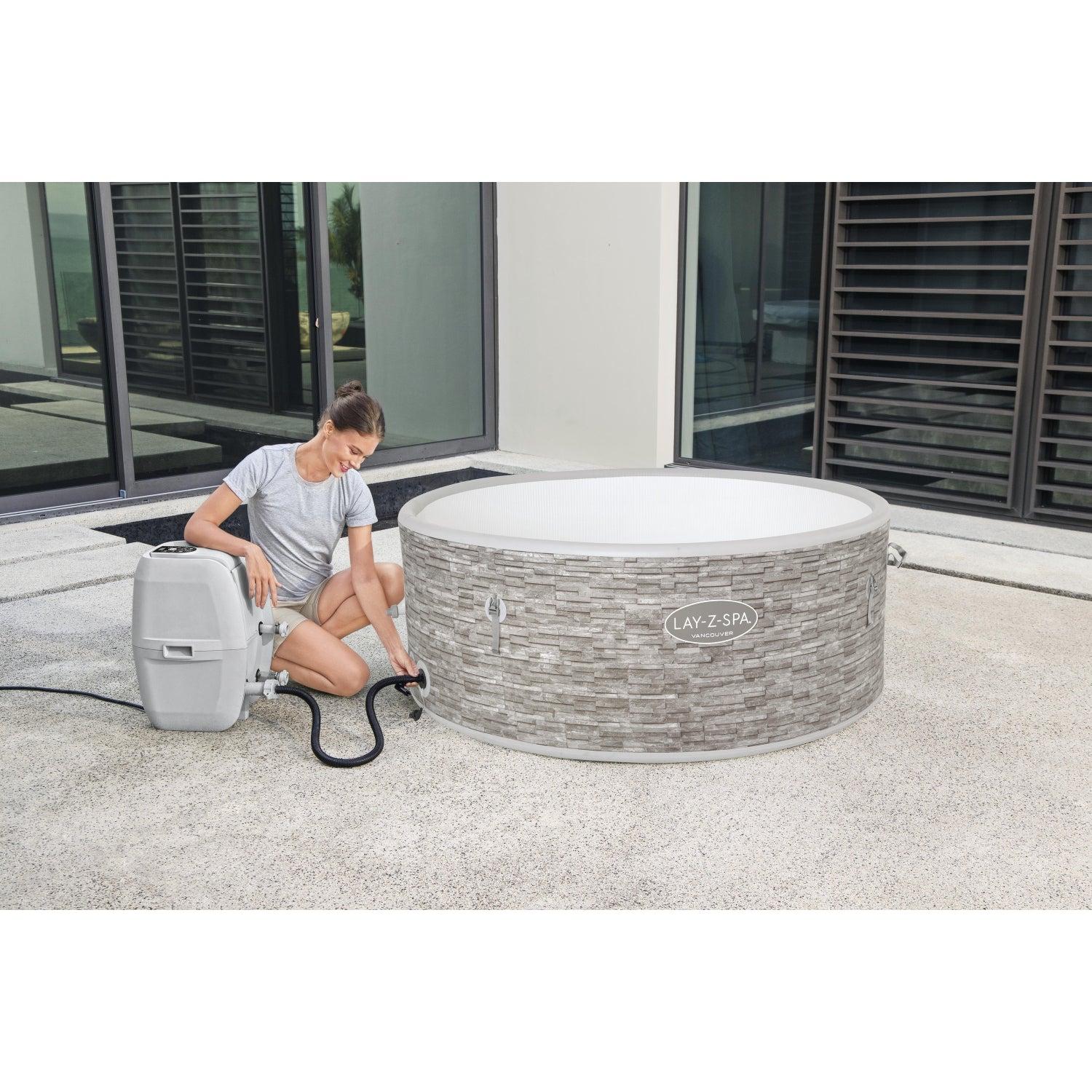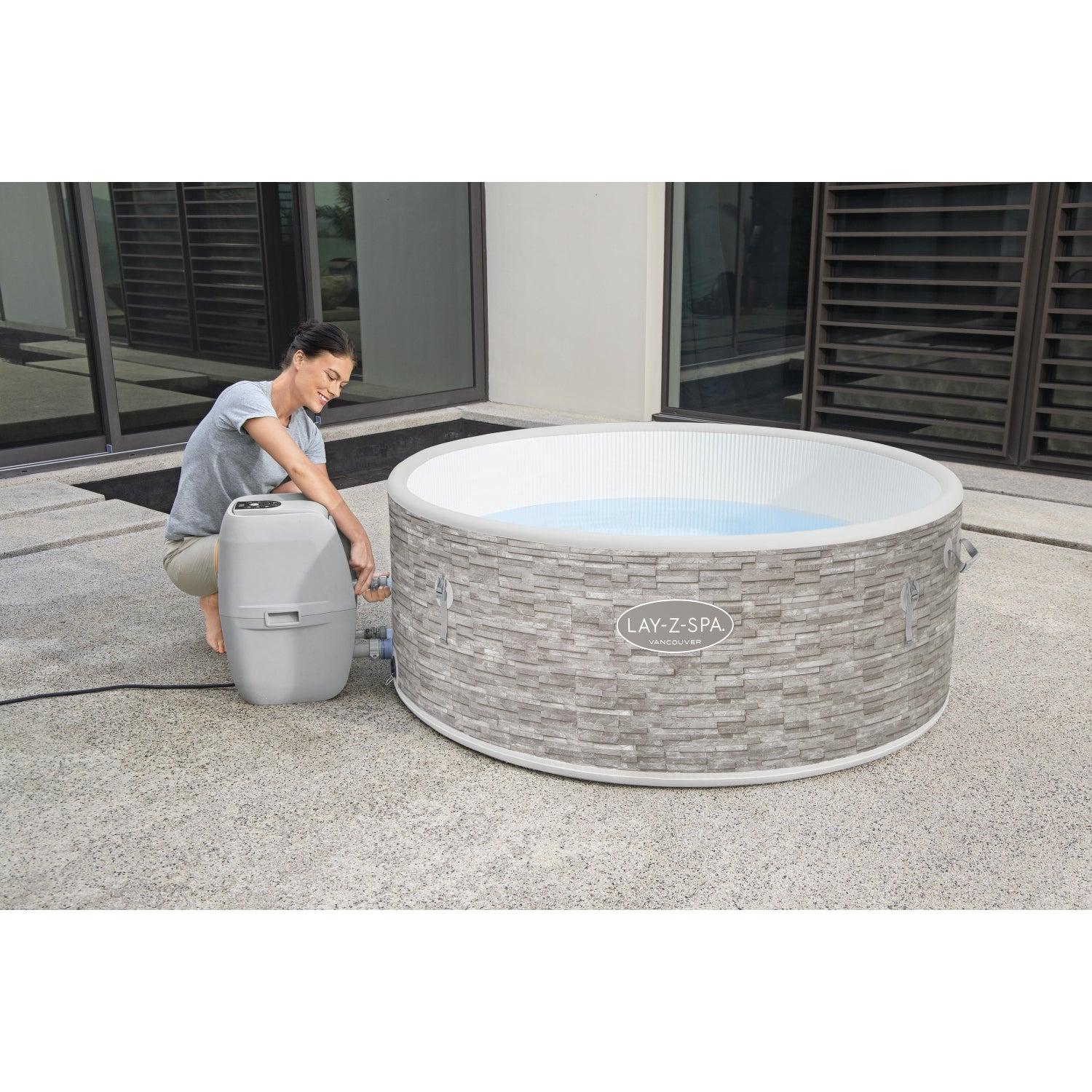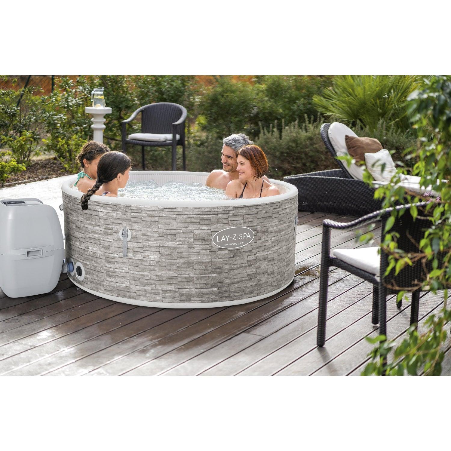 • Panel de control digital y bomba de spa con sistema de filtración integrado que incluye portavasos y es accesible desde el interior del spa
