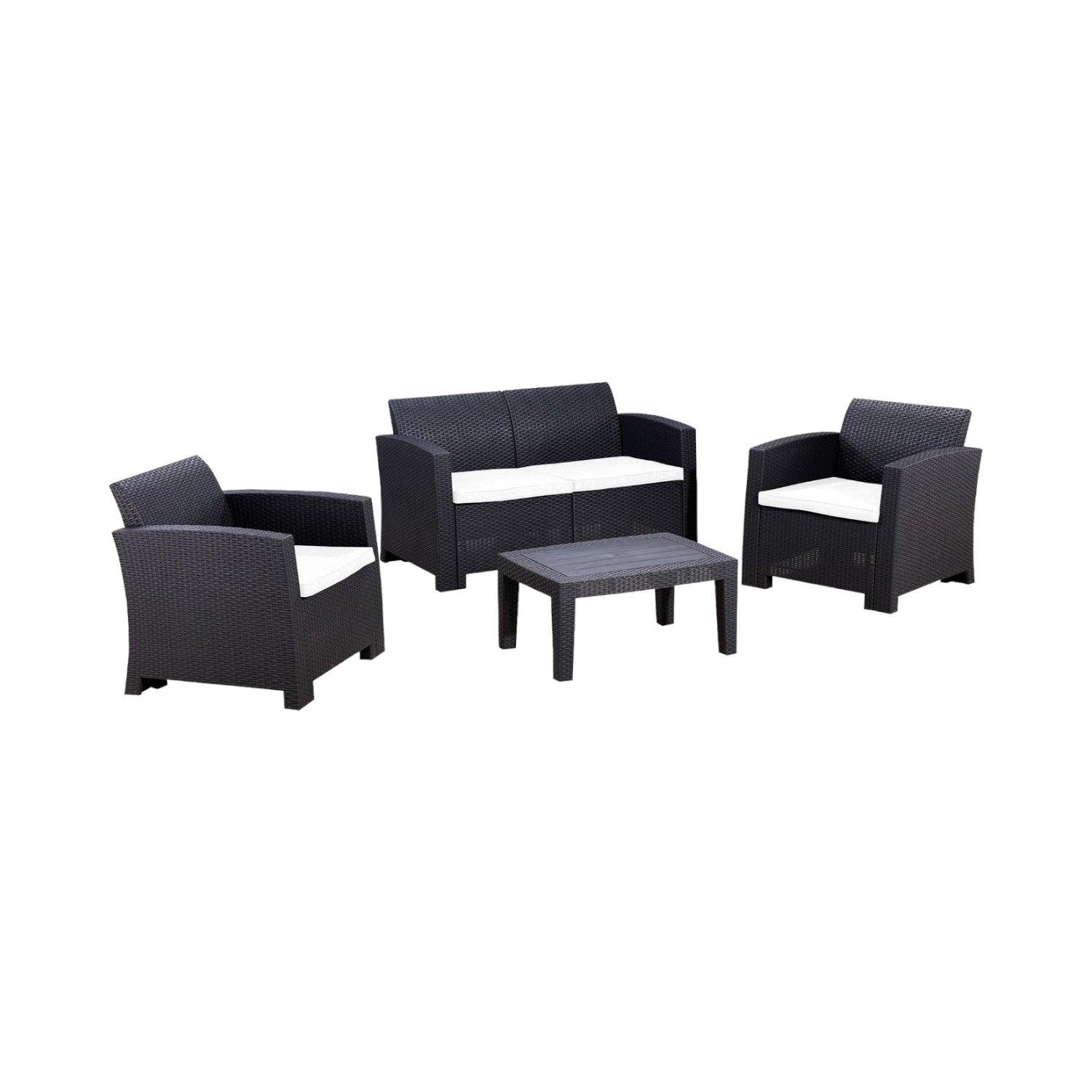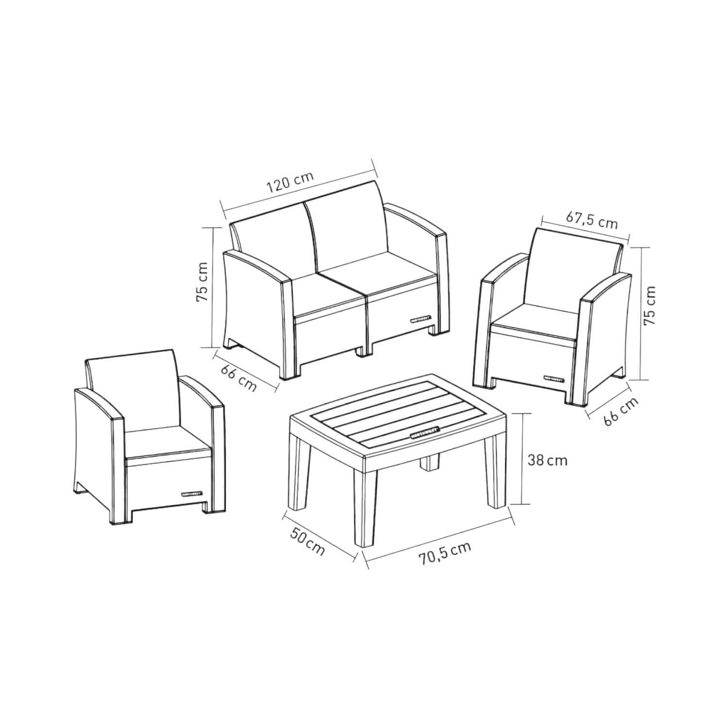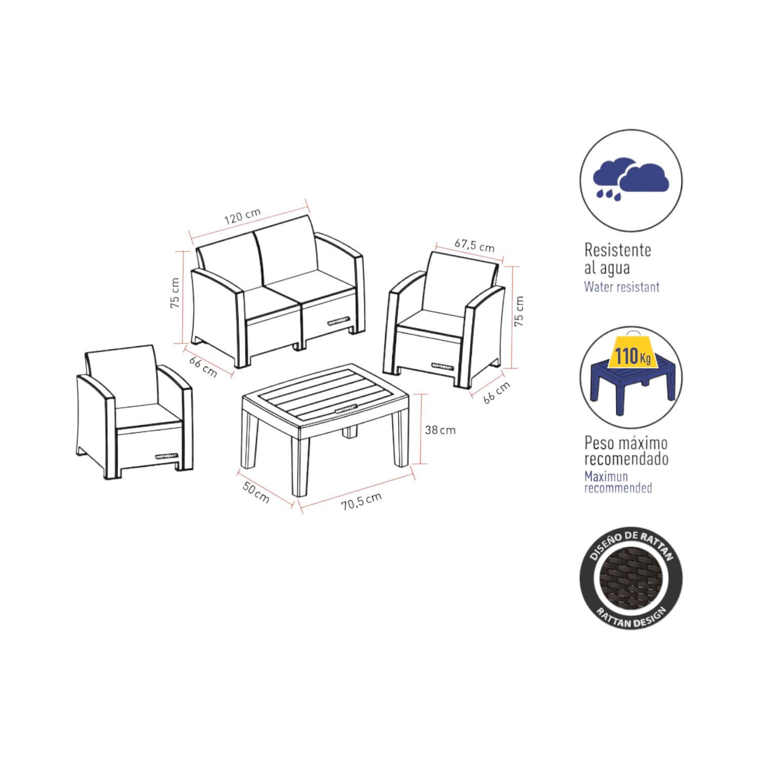 • Incluye: 2 sillones, 1 sillón 3 cuerpos con cojines de poliéster y 1 mesa