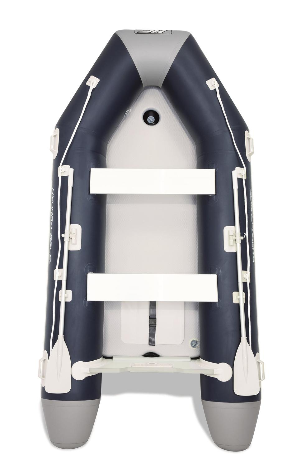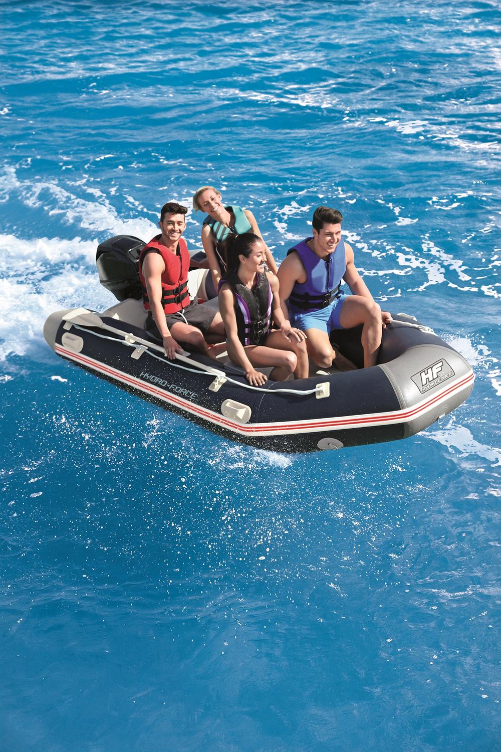 La lancha inflable Hydro-Force™ Mirovia Pro está diseñada para 5 personas y te brindará increíbles aventuras de fin de semana, aunque también está pensada para un uso prolongado y regular. Si quieres dotar a esta lancha de más potencia, puedes colocar un motor de 15 HP en su correspondiente soporte, gracias al travesaño de tablero marino contrachapado. Las 3 cámaras de air con válvulas de bajo perfil y la prolongación de los laterales traseros brindan al modelo Mirovia Pro mayor flotabilidad y estabilidad en el agua, y minimizan el impacto de posibles perforaciones. Esta lancha está fabricada con tecnología Tritech™, un material reforzado de 3 capas con un núcleo de malla de poliéster alojado entre 2 capas de PVC, lo que la dota de mayor resistencia sin que resulte pesada o voluminosa. La quilla del barco apunta al agua, lo que proporciona más velocidad y capacidad para controlar las olas. Las planchas de aluminio y los remos no son los únicos accesorios que vienen con esta lancha deportiva inflable. También incluye un cordón de remolque, una bomba de mano Air Hammer™, un manómetro, una bolsa de transporte y un kit de reparación. La lancha inflable Mirovia Pro tiene todo lo que necesitas para vivir momentos inolvidables en el lago.