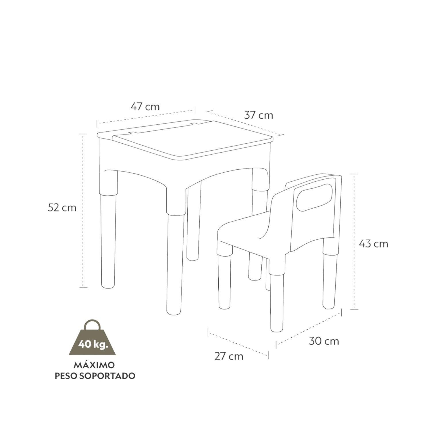 • La superficie de la mesa se puede abrir y almacenar algunas cosas pequeñas como lápices y crayones