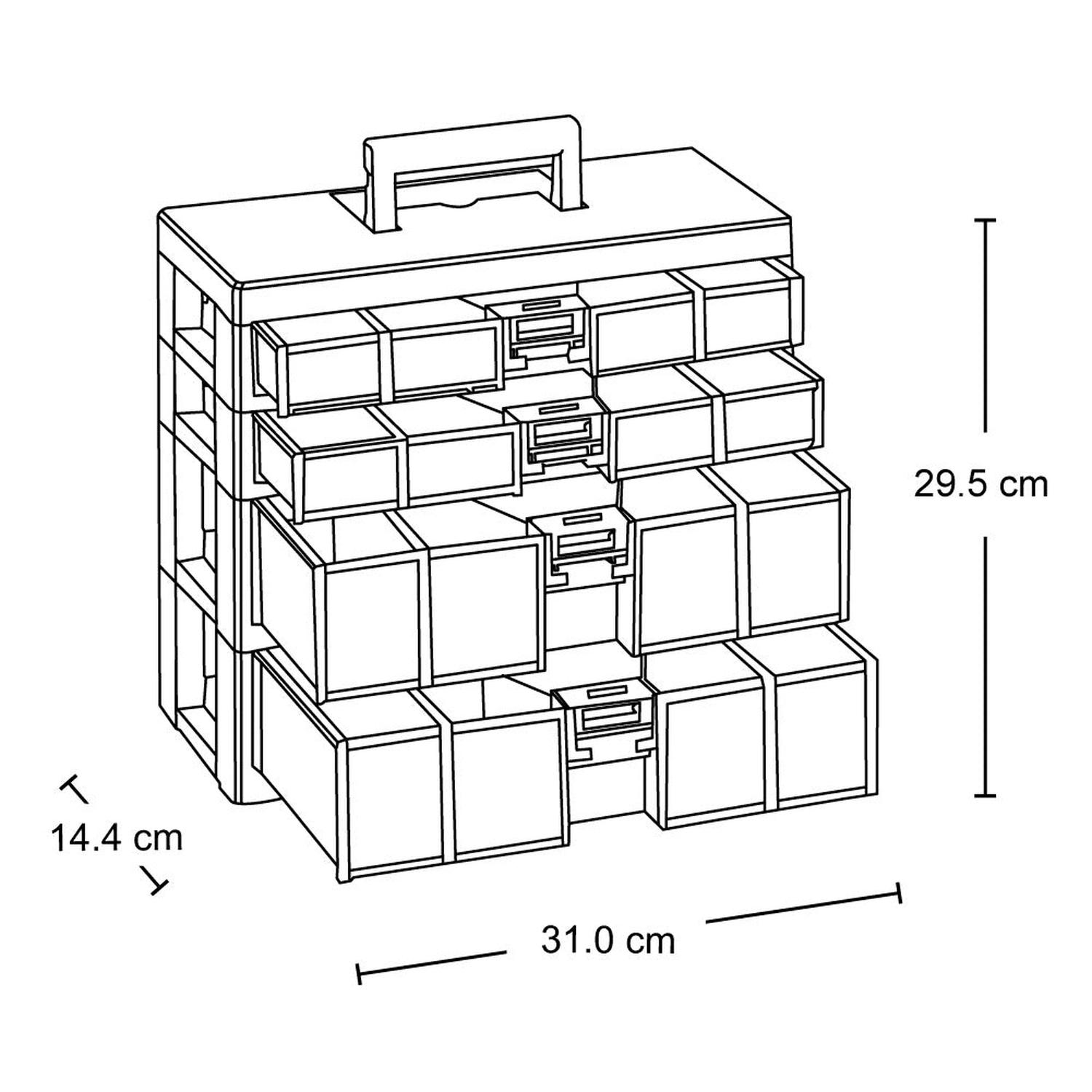 Caja organizadora Rimax, ideal para usarla para clasificar objetos pequeños. Tiene cuatro cajones, los cuales tienen 20 divisiones removibles que se pueden ajustar de acuerdo a sus requerimientos. Sirve tanto para el hogar como para la dotación de oficinas, tiendas, supermercados, farmacias, entre otros. Su material de mezcla de Polipropilenos, homopolímeros y Copolimeros lo hace de gran resistencia y facilita la higiene en cualquier lugar. Es de fácil mantenimiento, usando un jabón suave con cepillo es suficiente para quitar manchas.
