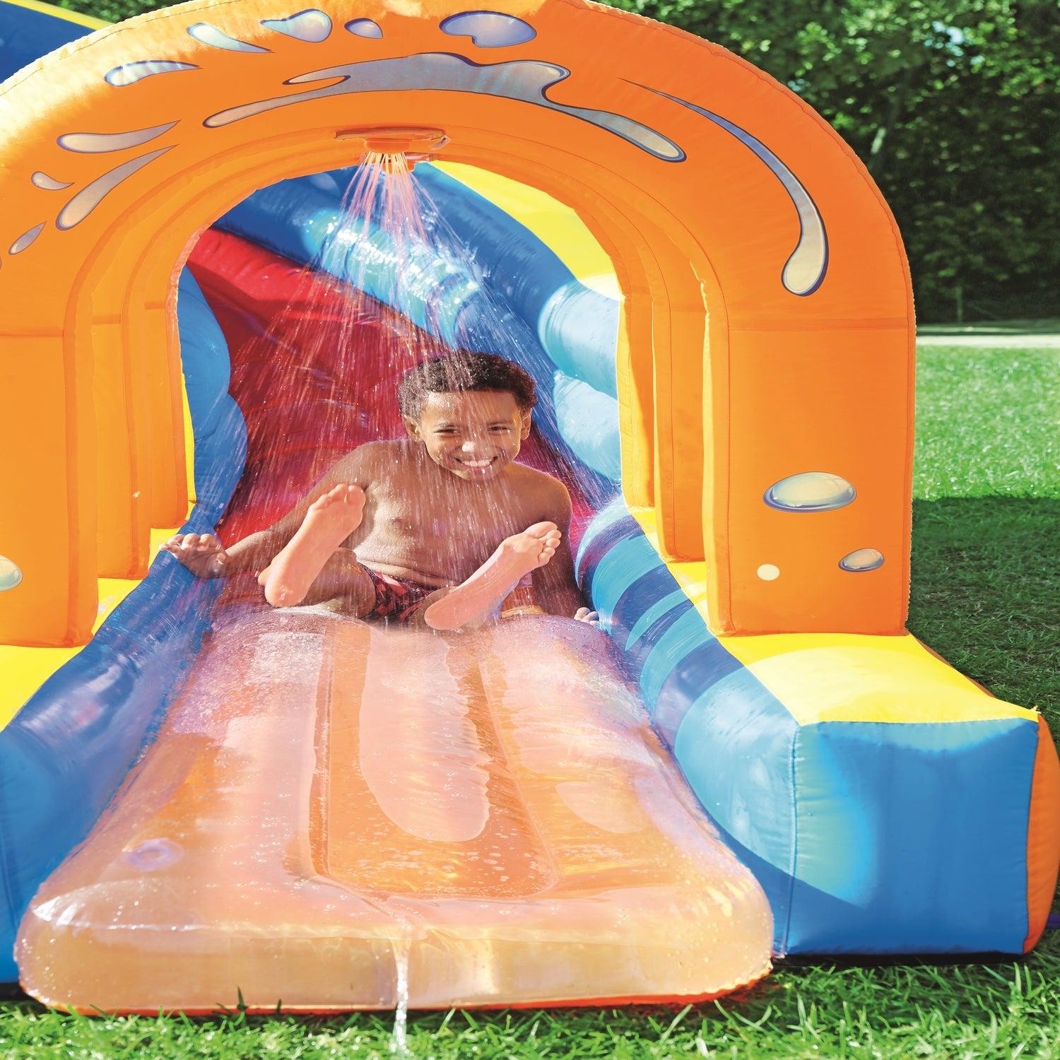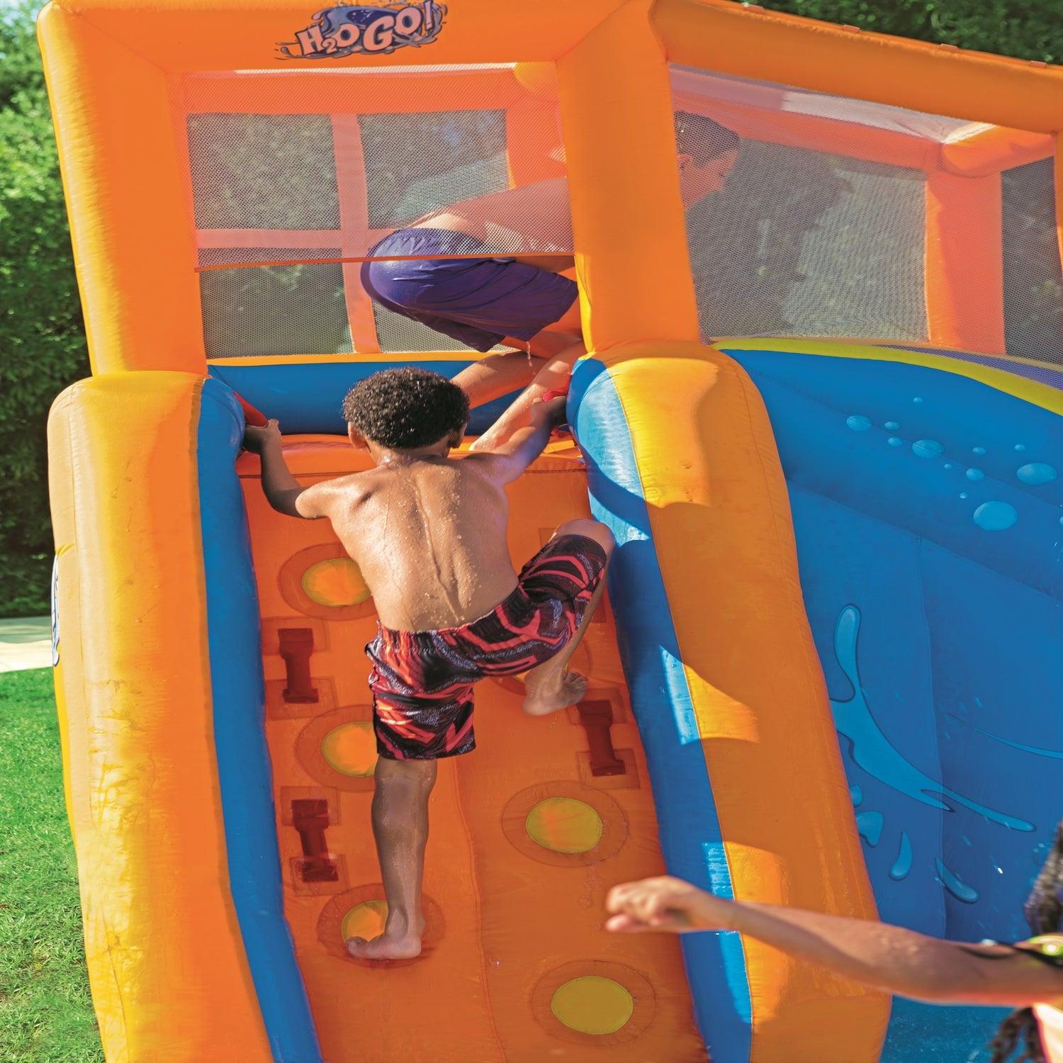 El parque acuático Hurricane Tunnel Blast es una zona de juego extravagante para escalar, deslizarse y más. El parque cuenta con un muro de escalada con asideros y puntos de apoyo para una acción de escalada seria. Una vez que los niños llegan a la cima de la pared de escalada, están protegidos por una pared especial de malla de seguridad. ¡Las paredes de malla brindan seguridad sin obstaculizar la escalada o el deslizamiento! Salta por el tobogán curvo y disfruta de un acabado sorpresa especial: ¡un aterrizaje de gotas de agua! La gota de agua permite un aterrizaje suave mientras los niños se deslizan por el túnel de rociado. El túnel de rociado rocía agua constantemente para mantener el parque húmedo y refrescar a los niños. La base del parque es una gran piscina de juegos donde los niños pueden relajarse o chapotear antes de comenzar otra escalada y deslizarse. Use el área de almacenamiento de zapatos de malla para mantener los zapatos secos y convenientemente ubicados. El parque cumple con todos los estándares de seguridad ATSM ya que el material de poliéster recubierto de PVC es duradero pero proporciona una sensación y un tacto cómodos para los niños. El ventilador de 220-240V para trabajo pesado con enchufe de seguridad GFCI infla el parque acuático en menos de dos minutos.