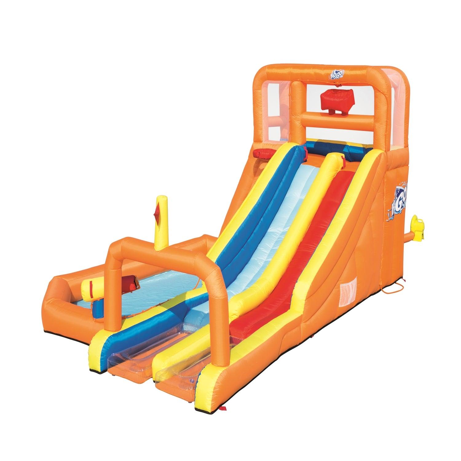 Tsunami Waves Summit es un parque acuático adecuado para grupos, fiestas y eventos memorables. ¡La próxima adición para su cumpleaños de barbacoa o fiesta de la cuadra está aquí! El parque cuenta con dos toboganes con parachoques de seguridad para que los niños puedan correr todo el día. Cada diapositiva presenta un aterrizaje de gotas de agua suave para una alegría instantánea. Hay mucho para explorar con una piscina de juegos extra grande, un túnel y un aro de bolas. La piscina se puede usar para refrescarse antes de otro viaje por el tobogán. También cuenta con un blaster de agua incorporado para remojar a los amigos: ¡solo apunta y rocía! El aro de pelota y el túnel mantendrán a todos entretenidos mientras se turnan en el tobogán. Llegue a la cumbre del parque a través de la pared de escalada con asideros y puntos de apoyo. El muro conduce a la plataforma de la torre que está asegurada con paredes de malla para mayor estabilidad y seguridad. El parque cumple con todos los estándares de seguridad ATSM y está construido con material de poliéster recubierto de PVC que es duradero pero proporciona una sensación y tacto cómodos para los niños. El ventilador de 220-240V para trabajo pesado con enchufe de seguridad GFCI infla el parque acuático en menos de dos minutos.