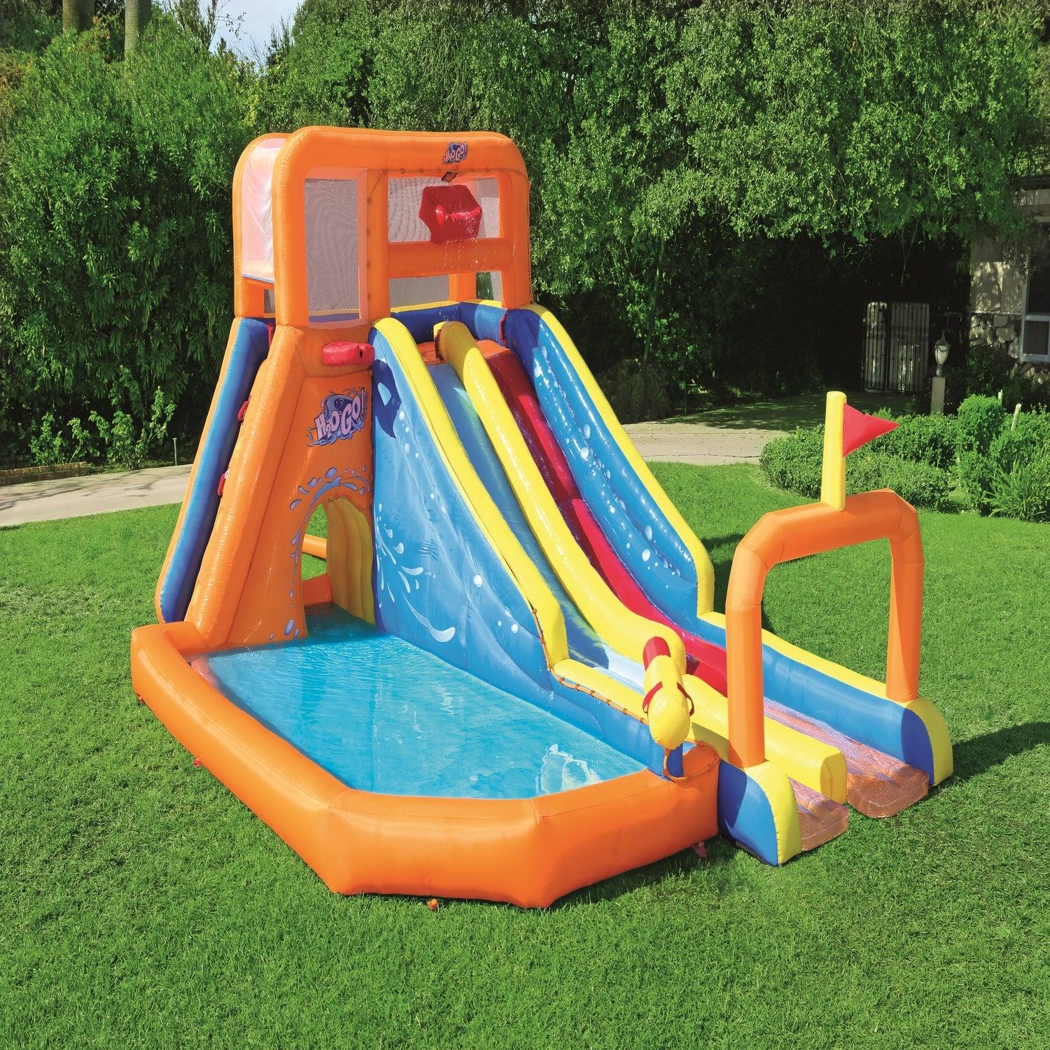 • Viene con un balde que arroja agua al azar para una sorpresa empapada. Esto también mantiene el deslizamiento resbaladizo para paseos más divertidos.