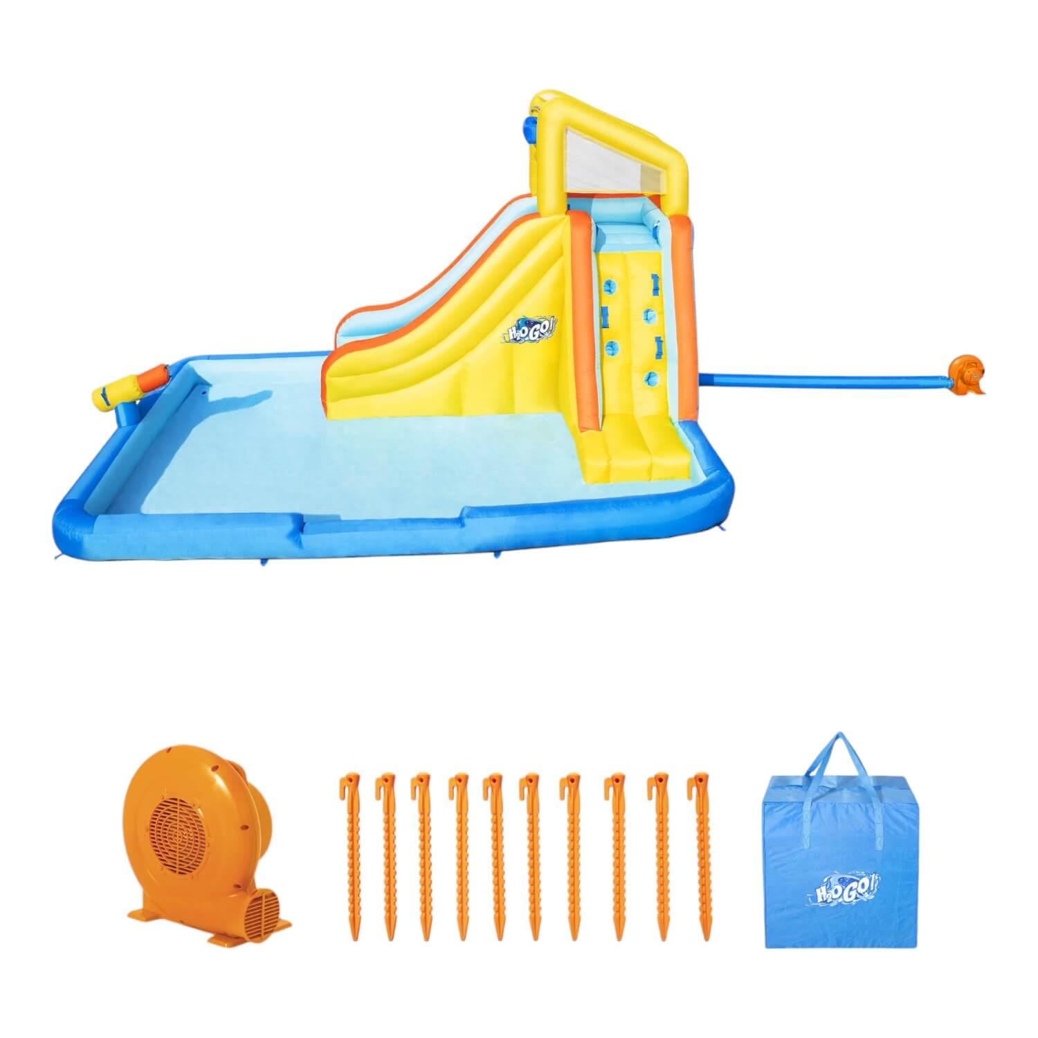 • Contenido: 1 tobogán, 1 soplador (estacas incluidas), 1 kit de reparación (varios parches surtidos), 1 bolsa de almacenamiento, 10 estacas de rebote, 1 conjunto de manguera de rociado de agua