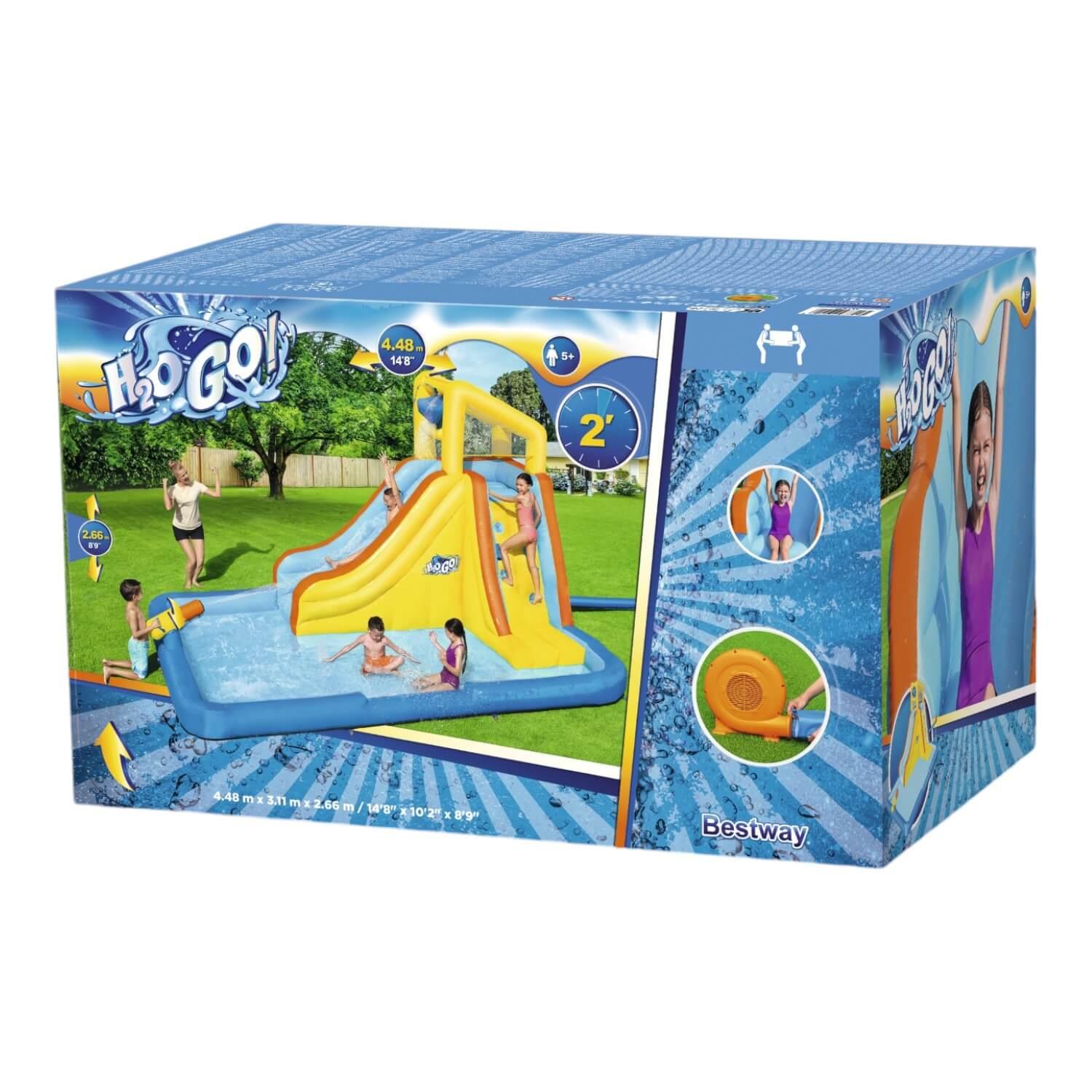 • La configuración es rápida y fácil. El soplador de alta resistencia infla el parque acuático en menos de 2 minutos.
