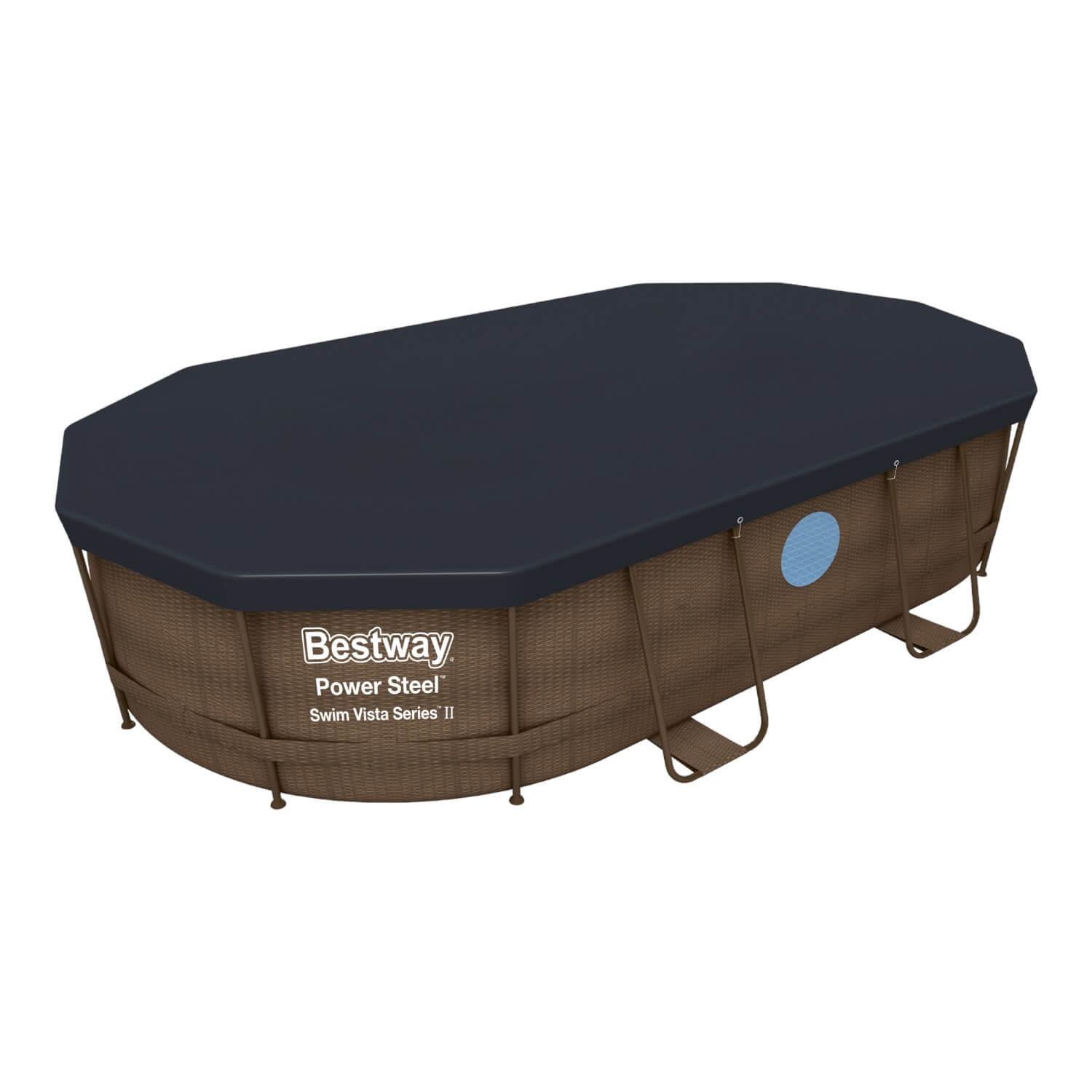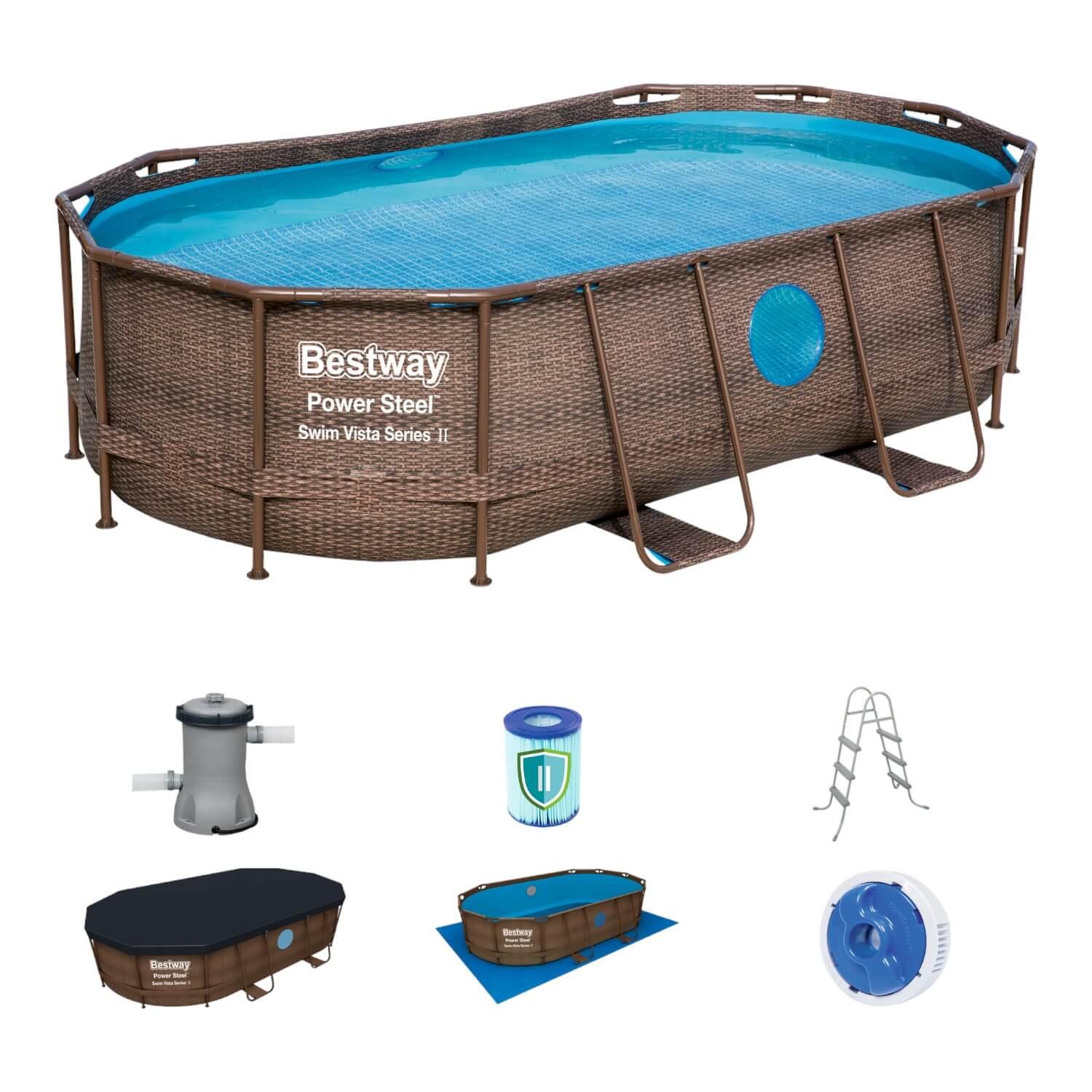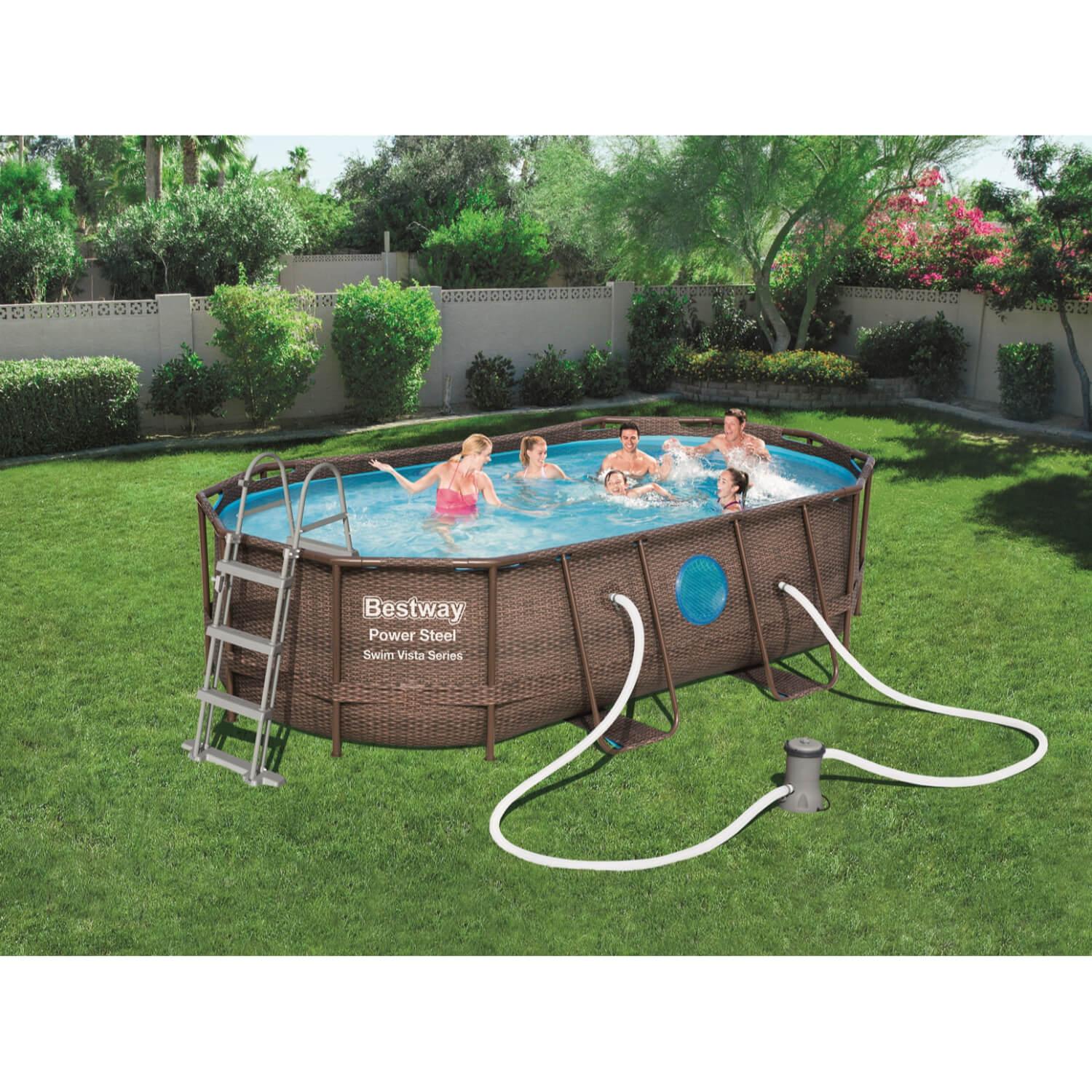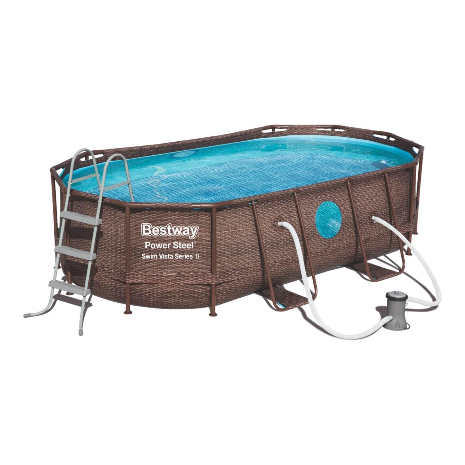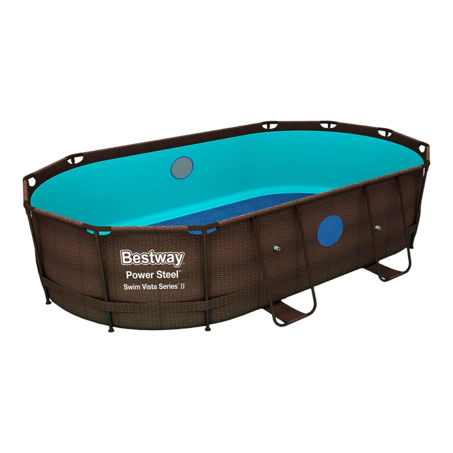 Con la piscina ovalada desmontable Power Steel Swim Vista de Bestway, la diversión en el baño está garantizada todo el verano. Esta piscina portátil se monta fácilmente, sin herramientas, y ya está lista para usar. Es muy estable y duradera por la robusta estructura de acero con protección anticorrosión y el material reforzado TriTech. Dicho material consta de tres capas, con un núcleo de malla de poliéster recubierto a ambos lados por PVC laminado para mayor resistencia. Además, el refuerzo de 3 capas en la base y la correa de PVC dan aún más estabilidad a las paredes. El sistema de unión Seal & Lock protege los tubos de la entrada de agua y evita el desgaste de la capa anticorrosión. La válvula de drenaje incorporada se conecta a una manguera de jardín con el adaptador para vaciar el agua de manera fácil y sencilla. La depuradora de filtro mantiene el agua limpia y el cartucho de filtro antimicrobiano evita las algas y el moho. Para mayor seguridad, la escalera evita que los niños se bañen sin supervisión. Con el dibujo de azulejos interior y el aspecto de ratán exterior, esta piscina elevada goza de un aspecto elegante, y las ventanillas crean una diversión interactiva. Llena al 90%, la piscina portátil tiene una capacidad de 7.250 litros.