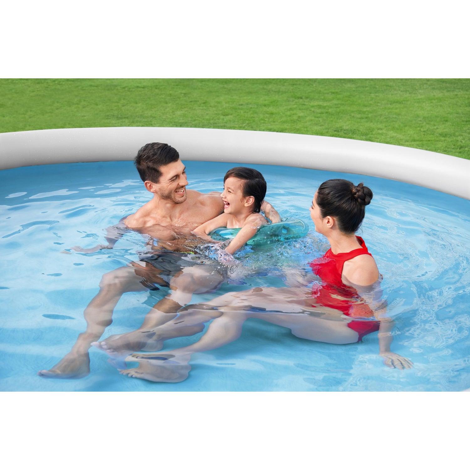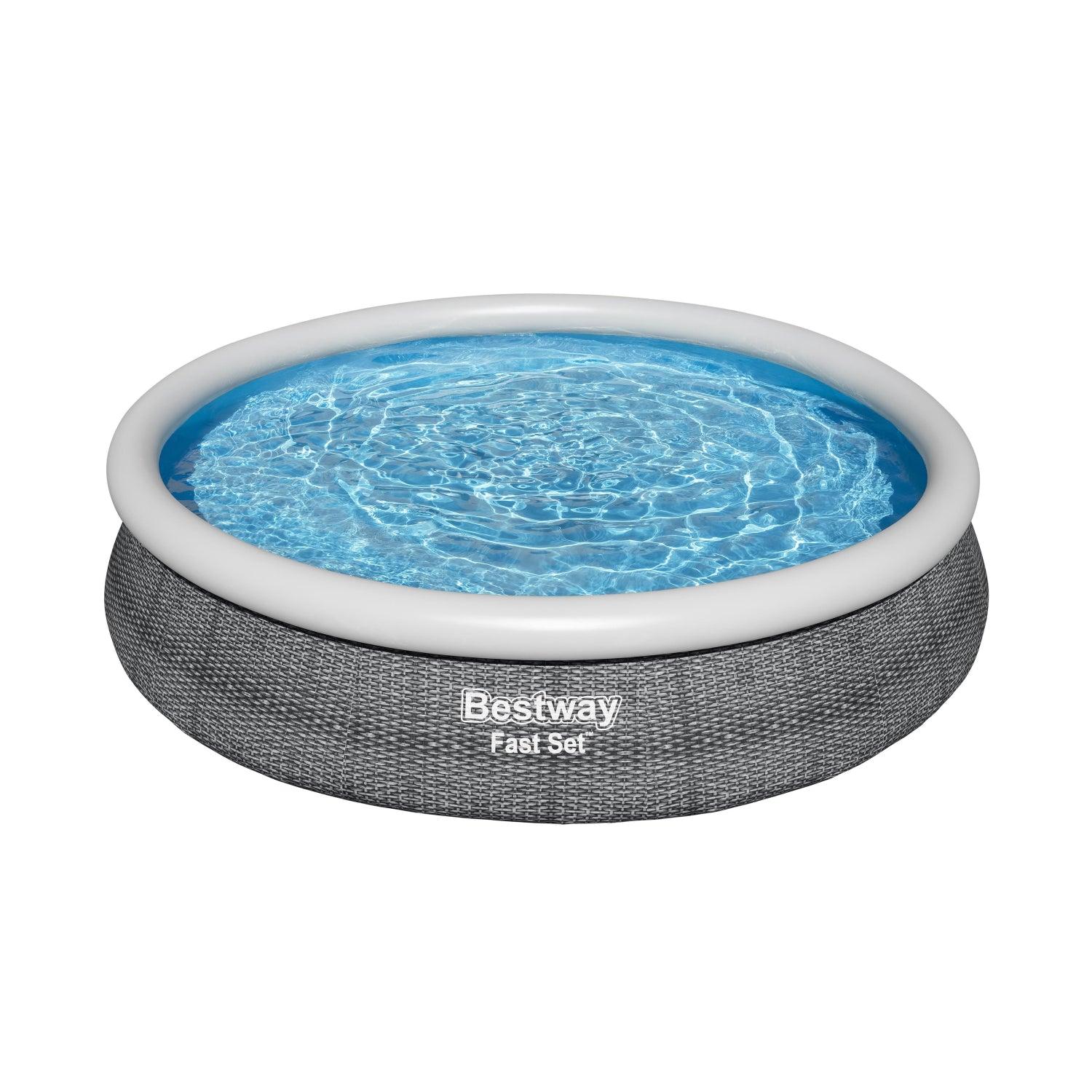 Con este rápido y sencillo conjunto de piscina Fast Set™ de Bestway®, ¡estarás listo para un día de piscina en un santiamén! El proceso de instalación Fill & Rise es sencillo: solo tienes que seleccionar una superficie nivelada, inflar el anillo superior y la piscina se elevará a medida que se llena de agua. El resistente revestimiento DuraPlus™ está fabricado con un material de 3 capas ultraduradero que está reforzado para mayor resistencia y es un 85 % más resistente a las perforaciones que el PVC. El atractivo revestimiento también presenta un estampado de ratán realista que aportará un aspecto y una sensación de elegancia a tu patio trasero. Cuando termina la temporada, el almacenamiento es rápido y sencillo. El agua se libera fácilmente a través de la válvula de drenaje de control de flujo y luego la piscina se puede plegar para un almacenamiento compacto fuera de temporada. También se incluye con el conjunto una bomba de filtrado para ayudar a mantener el agua limpia. Esta piscina es la opción ideal para familias que buscan una opción de piscina rápida y sencilla para su patio trasero. Los niños disfrutarán de pasar sus días de verano chapoteando y jugando en el agua, y los padres también pueden disfrutar de un agradable y relajante chapuzón. ¡La temporada no estará completa sin la práctica piscina Fast Set de Bestway!