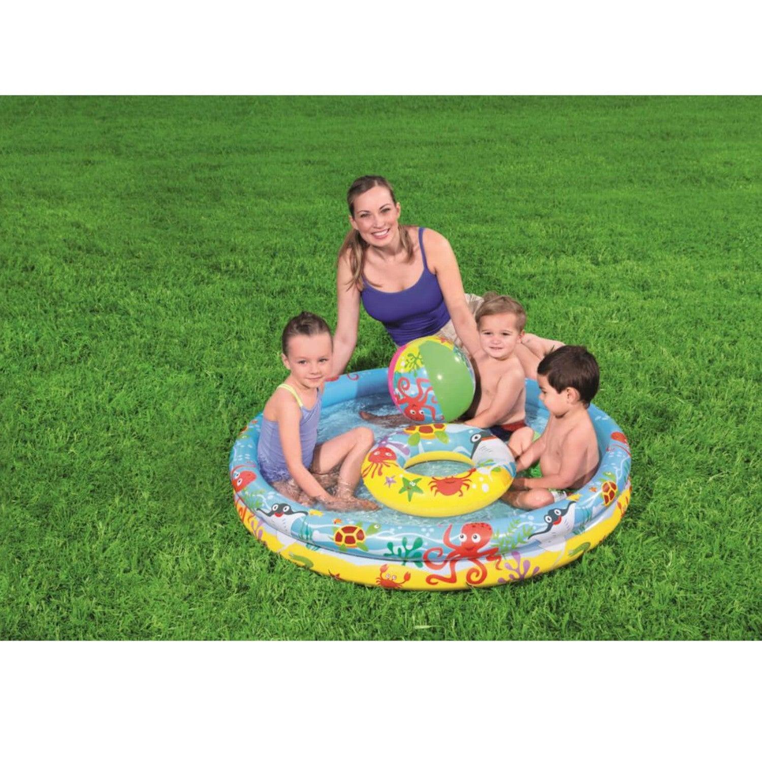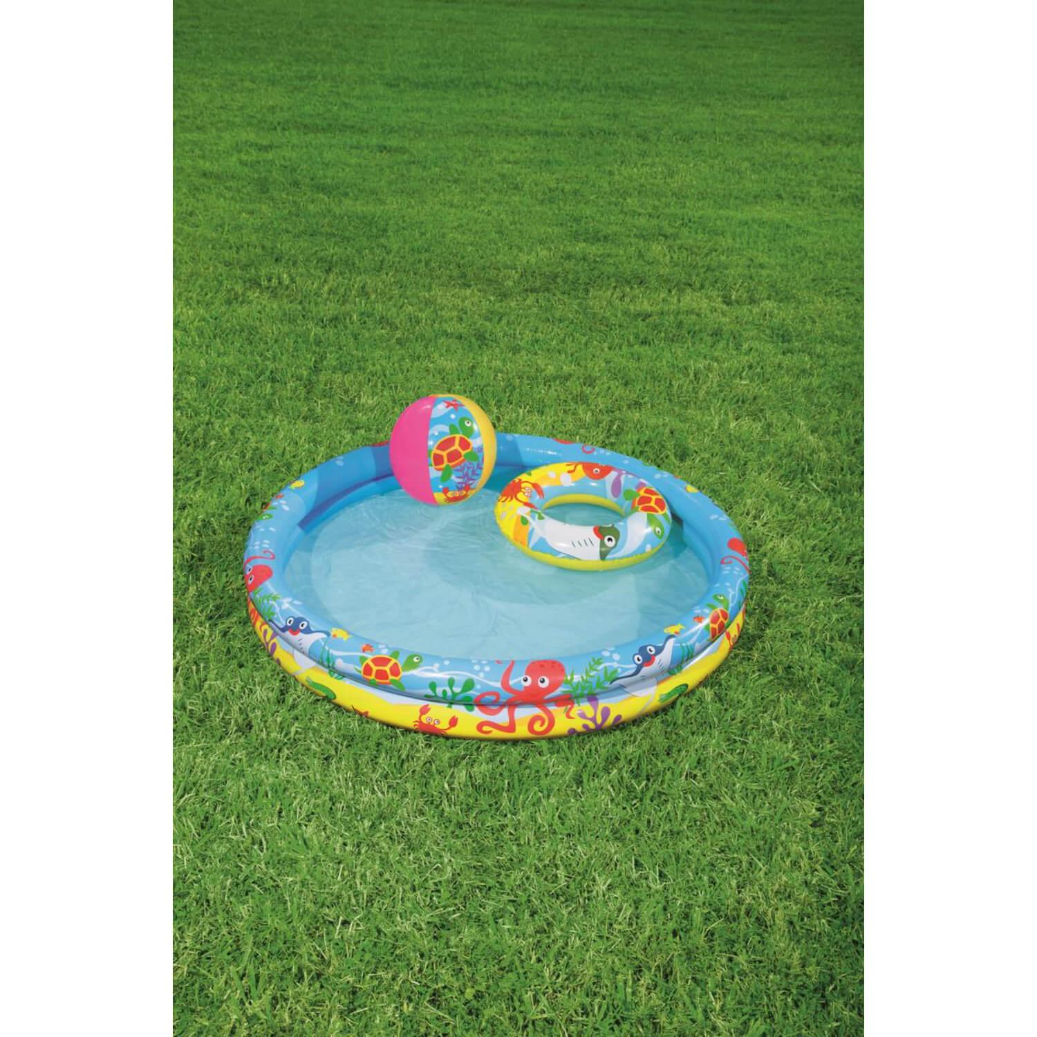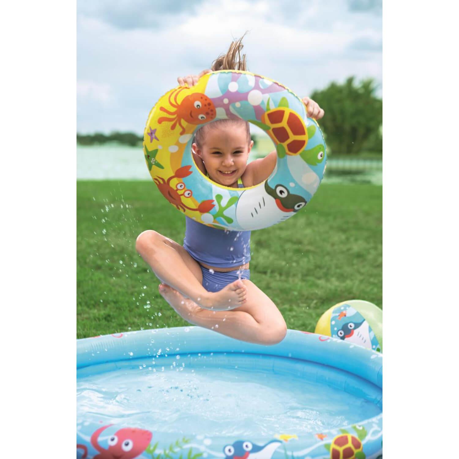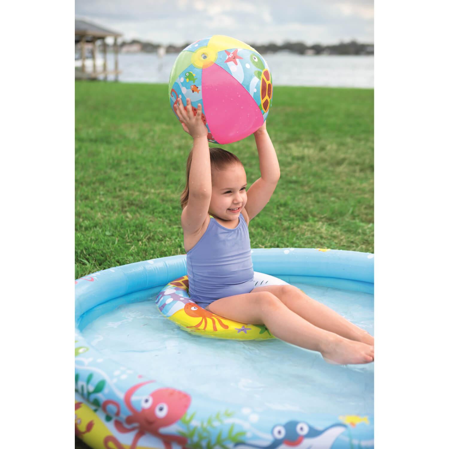 Haz que tu pequeño se pasee en grande con esta piscina infantil con accesorios. Esta piscina es muy fácil de hinchar y viene con una pelota de playa y un flotador infantil. Este conjunto de accesorios hace que puedas disfrutar de esta piscina de 137 litros (36 galones) en el jardín o llevártela allá donde quieras. La piscina, el flotador y la pelota de playa están hechos de vinilo resistente para tus pequeños jueguen todo lo que quieran cómodamente en los calurosos días de verano. Todos los accesorios tienen válvulas de seguridad para facilitar el hinchado y el deshinchado y la retención de aire marino óptima. También incluye un parche de reparación en caso de posibles perforaciones.