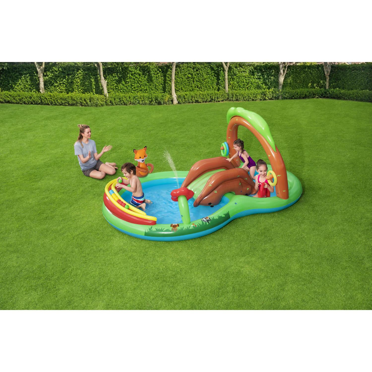 ¡Nada más que momentos divertidos en este cuello del bosque! El Bestway® Friendly Woods Play Center tiene muchas funciones para mantener a los niños entretenidos durante horas. Las piscinas dobles están unidas entre sí con un tobogán, y la flor también funciona como un aspersor de agua incorporado. Los niños pueden jugar con el rodillo del laberinto o tirar la canasta con el zorro, y pueden jugar el lanzamiento del anillo usando las clavijas en los troncos de los árboles. ¡Estos juegos no solo son divertidos, sino que también funcionan para desarrollar la coordinación mano-ojo! Se incluyen diez bolas de juego y cuatro anillos inflables. Este centro de juegos es muy fácil de instalar, desmontar y almacenar.