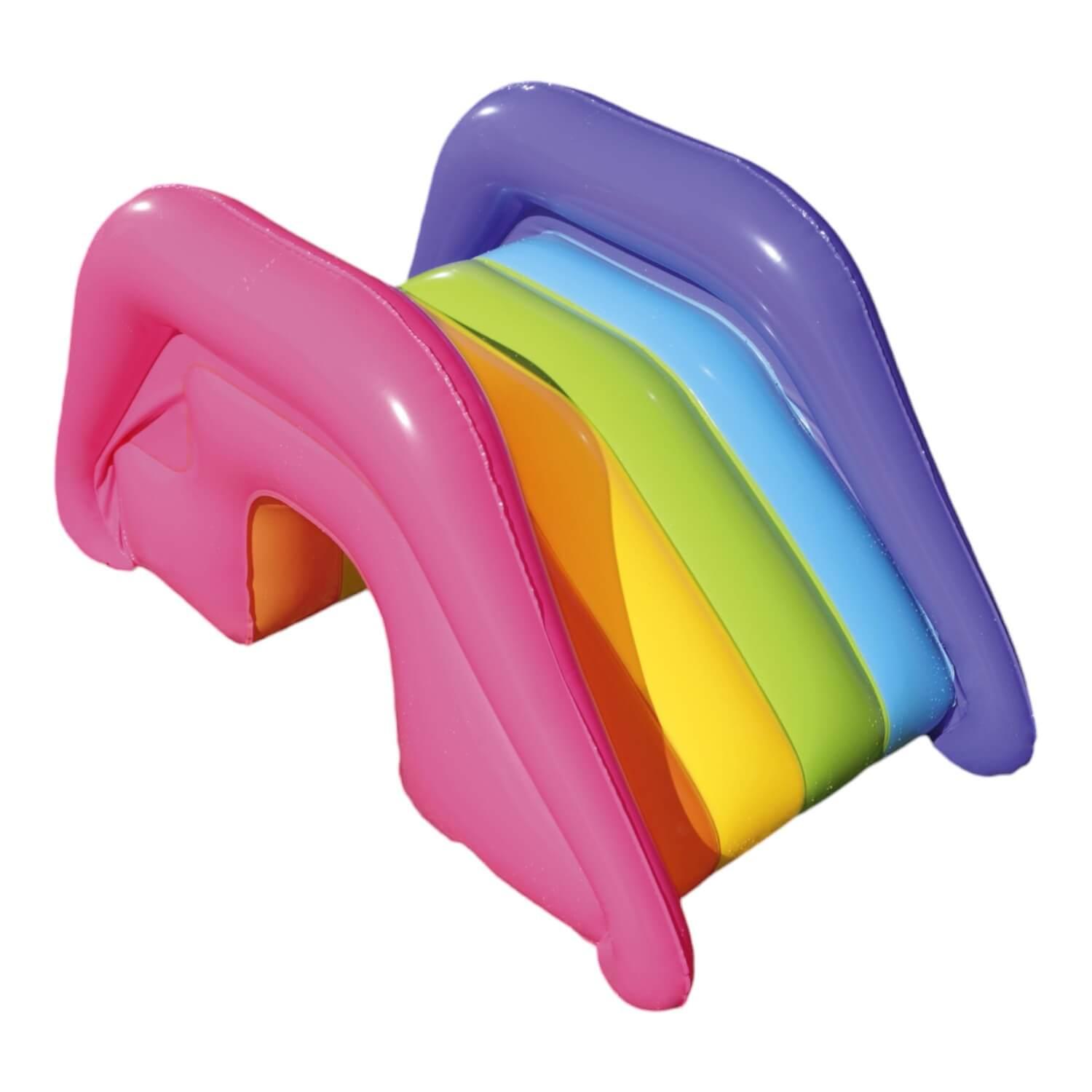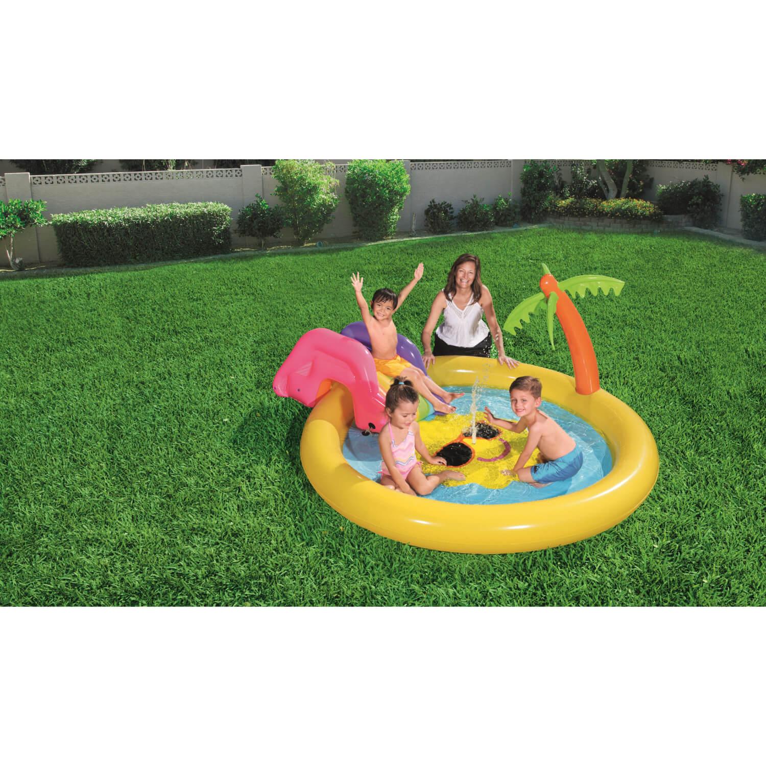 La piscina de juegos Sunnyland Splash es un refugio para los pequeños en los sofocantes días de verano. El sol que hay diseñado en el centro de la piscina es muy molón y esconde una sorpresa … ¡También lleva un aspersor incorporado que mantendrá fresquitos y entretenidos a los pequeños! Solo tienes que llenar la piscina de agua, conectarla a una manguera de jardín y la fuente empezará a lanzar chorros. Ninguna piscina es del todo completa sin un tobogán, y el que tiene esta es de los colores del arcoíris y totalmente ajustable, ya que lleva arandelas incorporadas. La palmera hinchable está situada junto a la piscina y puede utilizar para recuperar el equilibrio después de haber tirado por el tobogán … ¡o como fondo paradisíaco para una buena foto!