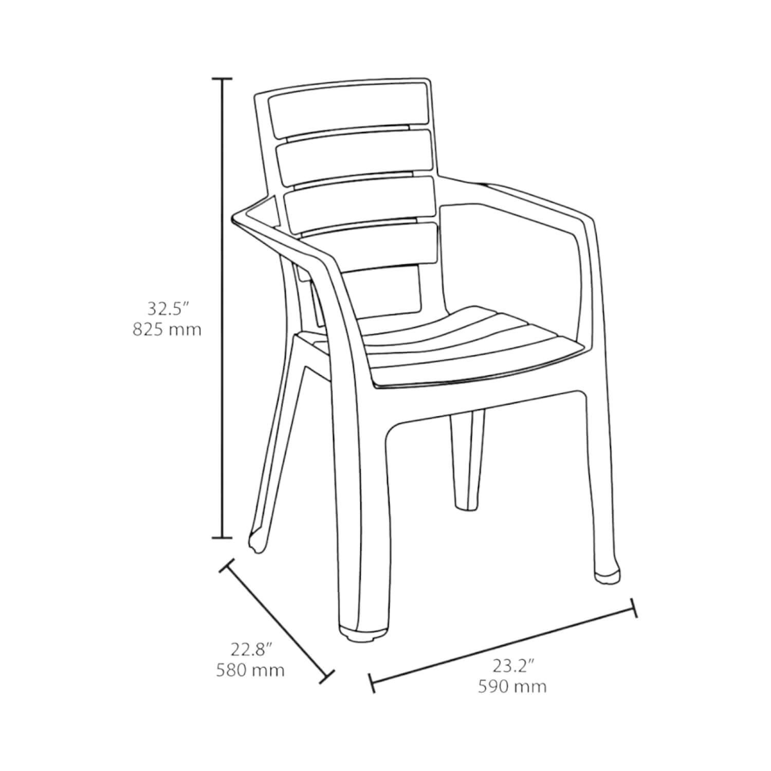 La apariencia de madera regresa para ser protagonista con la línea de Rimax, con detalles únicos y textura muy natural. Apariencia mate y fáciles de limpiar. Silla con brazos y textura de madera en el espaldar, diseño ergonómico y espacio entre el espaldar y el sentadero, presentando un estilo contemporáneo. Con tacones antideslizantes, estructura robusta y estable. Es de fácil mantenimiento, usando un jabón suave con cepillo es suficiente para quitar manchas. Resiste hasta 115 Kg.