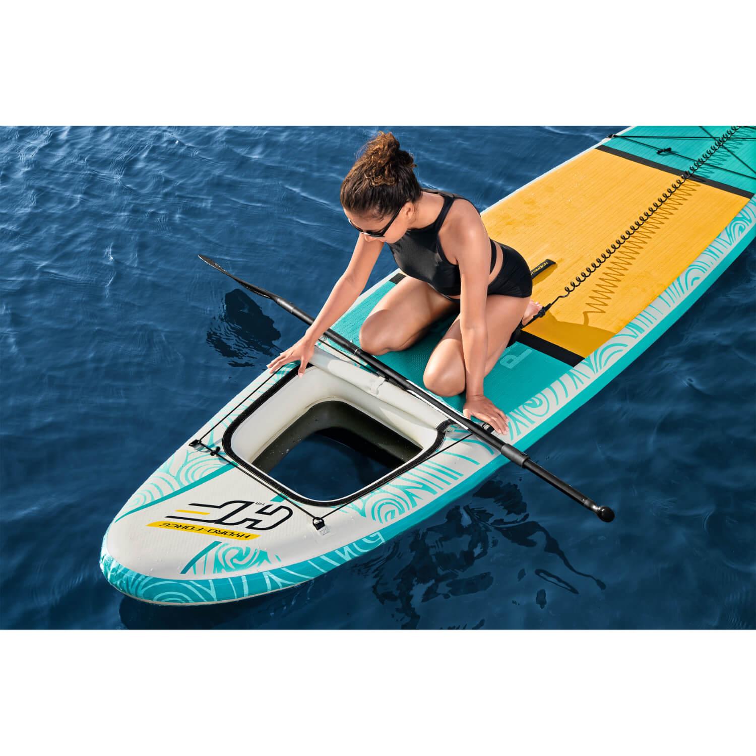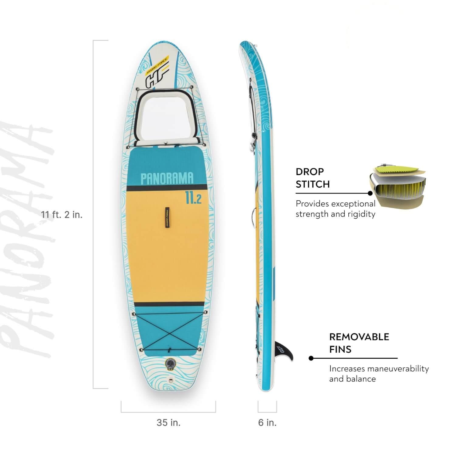 ¡El juego de tablas de surf de remo inflables Hydro-Force Panorama está listo para la acción! Con una ventana incorporada, esta tabla de remo brinda una experiencia única en el agua. ¡Puedes ver a través del agua debajo y contemplar los peces y otros animales acuáticos mientras nadan! Cuando desee sellar la ventana para bloquear la entrada de agua en viajes más largos, la cubierta incluida se fija de manera fácil y segura. Esta placa también está diseñada pensando en la facilidad de uso. Esta tabla está categorizada como SUP de travesía, lo que la hace ideal para paseos más largos en aguas tranquilas.